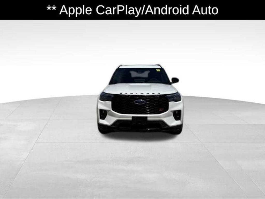 This 2025 Ford Explorer comes equipped with, ** Apple CarPlay/Android Auto, ** Backup Camera, ** Bluetooth, Hands Free, ** Cruise Control, ** Heated Seats, ** LED Headlights, ** Navigation System, ** Premium Sound System / Premium Audio, ** Remote Start, ** Satellite Radio, ** Stability Control, ** Steering Wheel Controls, ** USB Port, Explorer ST, 4D Sport Utility, 3.0L EcoBoost V6, 10-Speed Automatic, 4WD, White Metallic, Onyx Leather, 10 Speakers, 3.58 Non-Limited Slip Rear Axle, 3rd row seats: bench, 4-Wheel Disc Brakes, ABS brakes, Air Conditioning, Alloy wheels, Apple CarPlay/Android Auto, Auto High-beam Headlights, Auto-dimming door mirrors, Auto-dimming Rear-View mirror, Automatic temperature control, B&O Sound System by Bang & Olufsen, Brake assist, Bumpers: body-color, Compass, Delay-off headlights, Driver door bin, Driver vanity mirror, Dual front impact airbags, Dual front side impact airbags, Electronic Stability Control, Emergency communication system: 911 Assist, Equipment Group 400A Standard Package, Exterior Parking Camera Rear, Four wheel independent suspension, Front anti-roll bar, Front Bucket Seats, Front Center Armrest, Front dual zone A/C, Front fog lights, Front License Plate Bracket, Front reading lights, Fully automatic headlights, Garage door transmitter, Heated door mirrors, Heated front seats, Heated rear seats, Heated steering wheel, Heated/Ventilated Miko Sport Captain's Chairs, Illuminated entry, Knee airbag, Leather steering wheel, Low tire pressure warning, Memory seat, Multicontour Seats w/Front Active Motion, Navigation System, Occupant sensing airbag, Outside temperature display, Overhead airbag, Overhead console, Panic alarm, Panoramic Vista Roof w/Power Shade, Passenger door bin, Passenger vanity mirror, Power door mirrors, Power driver seat, Power Liftgate, Power passenger seat, Power steering, Power windows, Radio: B&O Sound System by Bang & Olufsen, Rain sensing wipers, Rear air conditioning, Rear anti-roll bar, Rear reading lights, Rear window defroster, Rear window wiper, Remote keyless entry, Security system, Speed control, Speed-sensing steering, Speed-Sensitive Wipers, Split folding rear seat, Spoiler, Sport steering wheel, Steering wheel mounted audio controls, Sun and Sound Package, Tachometer, Telescoping steering wheel, Tilt steering wheel, Traction control, Trip computer, Turn signal indicator mirrors, Variably intermittent wipers, Ventilated front seats, Wheels: 21" Magnetite-Painted Aluminum.