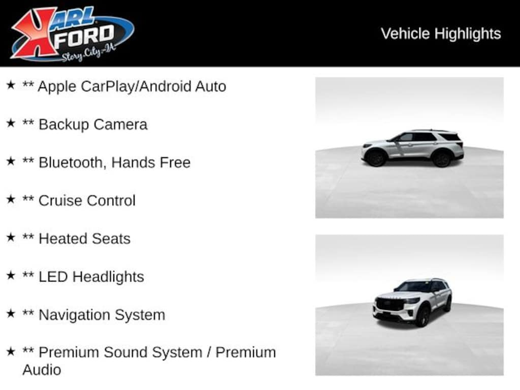 Your Dealer for Life, Karl Ford of Story City. When you buy a new car at Karl Ford of Story City you know you're finding a vehicle you can rely on. We have a great selection of new vehicles for you to test drive around Ames and Des Moines, IA. We also pride ourselves in creating a friendly atmosphere and reliable new car dealership that you can trust. Call us with any questions about our 2025 Ford Explorer and our experts will be glad to help you! (515) 733-4364. *Equipment and options are generated by a 3rd party vendor, exact vehicle options may vary. Please see a salesperson for complete details and vehicle information.