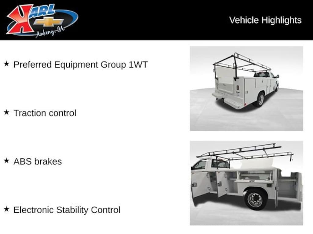 Summit White 2024 Chevrolet Silverado 4500HD Medium Duty with a 6.6L V8 Duramax Turbodiesel, 6-Speed Automatic and 4WD. This Silverado 5500 Stock #37621 has a READING Service body w/ladder rack. The Karl Auto Group with 5 locations across central Iowa is your go to destination for ALL your commercial vehicle needs. From new/pre-owned commercial vehicles to service and collision repairs the Karl Auto Group is here to be your one-stop shop. For more information on this or other work ready vehicles please contact Karl Chevrolet and ask for a commercial sales specialist.