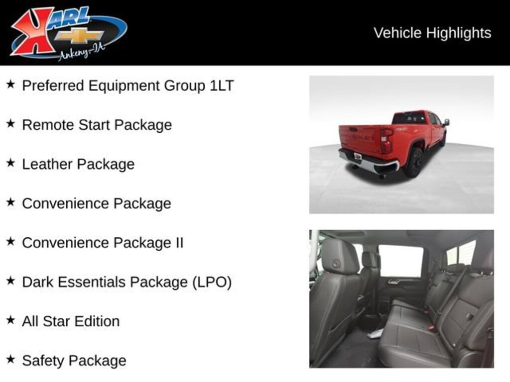 Factory MSRP: $79,269 $7,301 off MSRP! 10-Speed Automatic, 4WD, Black Leather, 10-Way Power Driver Seat Adjuster w/Lumbar, 120-Volt Bed Mounted Power Outlet, 120-Volt Interior Power Outlet, 170 Amp Alternator, 2 Charge/Data USB Ports Inside Center Console, 2-Speed Electronic Shift Transfer Case, 220 Amp Alternator, 4-Way Manual Driver Seat Adjuster, 6-Speaker Audio System, All Star Edition, Apple CarPlay/Android Auto, Auto-Dimming Inside Rear-View Mirror, Bed View Camera w/2 Trailer Camera Provisions, Black Chevytec Spray-On Bedliner, Black Mirror Caps, Black Name Plates (LPO), Black Tailgate Lettering (LPO), Bluetooth® For Phone, Bumpers: chrome, Chevrolet Connected Access Capable, Cloth Rear Seat w/Storage Package, Color-Keyed Carpeting Floor Covering, Compass, Convenience Package, Convenience Package II, Dark Essentials Package (LPO), Deep-Tinted Glass, Dual-Zone Automatic Climate Control, Electric Rear-Window Defogger, Electronic Cruise Control w/Set & Resume Speed, EZ Lift Power Lock & Release Tailgate, Floor-Mounted Center Console, Front Black Bowtie Emblem (LPO), Front Bucket Seats, Front LED Fog Lamps, Front License Plate Kit, Front Rubberized Vinyl Floor Mats, Gooseneck/5th Wheel Prep Package, Halogen Reflector Headlamps, HD Rear Vision Camera, HD Surround Vision, Heat Package, Heated & Auto-Dimming Vertical Trailering Mirrors, Heated Driver & Front Outboard Passenger Seating, Heated Steering Wheel, Heated Vertical Trailering Mirrors, Hitch Guidance w/Hitch View, In-Vehicle Trailering App System, Keyless Open & Start, Leather Package, LED Cargo Area Lighting, LED Smoked Amber Roof Marker Lamps, Manual Tilt & Telescoping Steering Column, OnStar Services Capable, Power Door Locks, Power Front Windows w/Driver Express Up/Down, Power Front Windows w/Passenger Express Down, Power Rear Windows w/Express Down, Power Sliding Rear Window w/Defogger, Preferred Equipment Group 1LT, Premium audio system: Chevrolet Infotainment 3 Premium, Push Button Start, Radio: Chevrolet Infotainment 3 Premium System, Rear 60/40 Folding Bench Seat (Folds Up), Rear Cross Traffic Alert, Rear Rubberized Vinyl Floor Mats, Remote Start Package, Remote Vehicle Starter System, Safety Package, SiriusXM w/360L Trial Subscription, Snow Plow Prep/Camper Package, Split folding rear seat, Standard Tailgate, Steering Wheel Audio Controls, Suspension Package, Trailer Camera Provisions, Trailer Side Blind Zone Alert, Ultrasonic Front & Rear Park Assist, Unauthorized Entry Theft-Deterrent System, Universal Home Remote, Up-Level Rear Seat w/Storage Package, Wheels: 20 High Gloss Black Aluminum (LPO), Wheels: 20 Transit Aluminum, Wi-Fi Hotspot Capable, Wireless Charging, Wireless Phone Projection, Wrapped Steering Wheel.