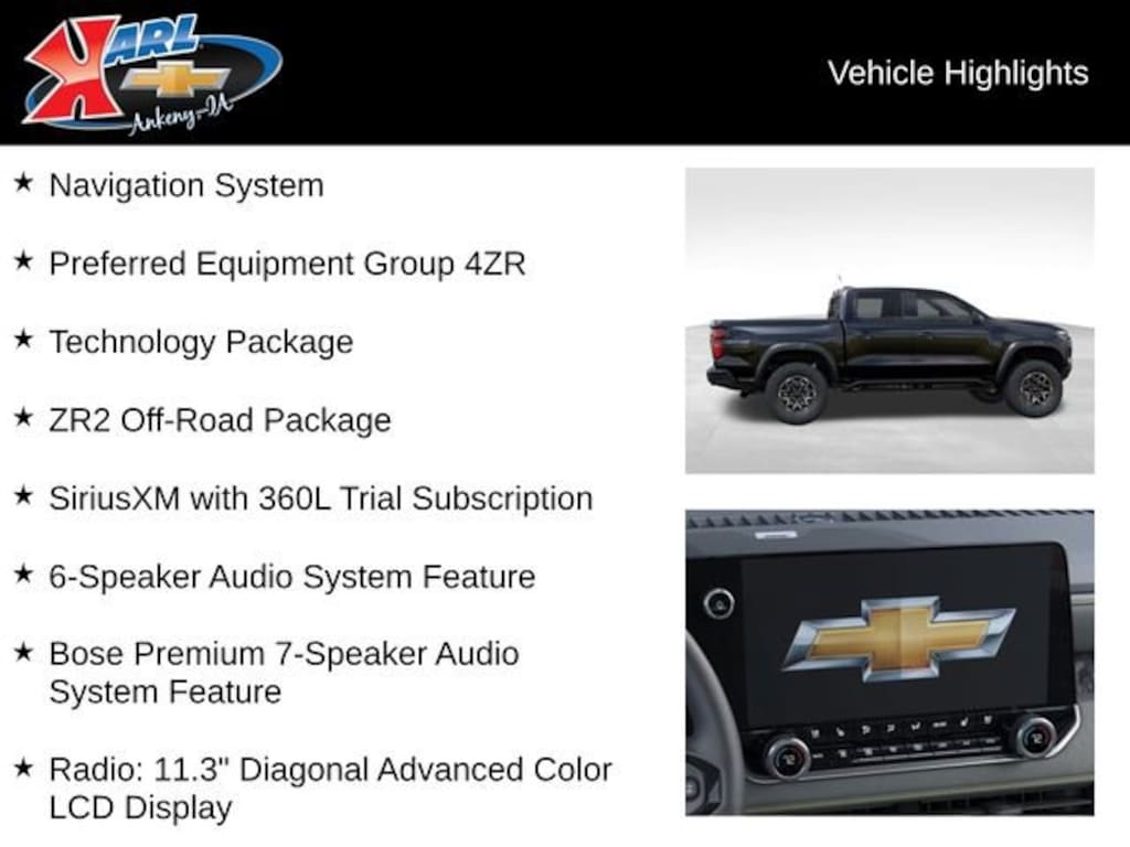 At Karl Chevrolet we want to help you find the best new or used car in Ankeny that suits your needs. When you buy a new car at Karl Chevrolet you know you're finding a vehicle you can rely on. We have a great selection of Platinum Quality Pre-Owned Vehicles. We also pride ourselves in creating a friendly atmosphere and a reliable Dealership that you can trust. Call us and our experts will be glad to help you! (515) 299-4300. *Equipment and options are generated by a 3rd party vendor, exact vehicle options may vary. Please see a salesperson for complete details and vehicle information. Price includes: $500 - Chevrolet Consumer Cash Program. Exp. 04/30/2026