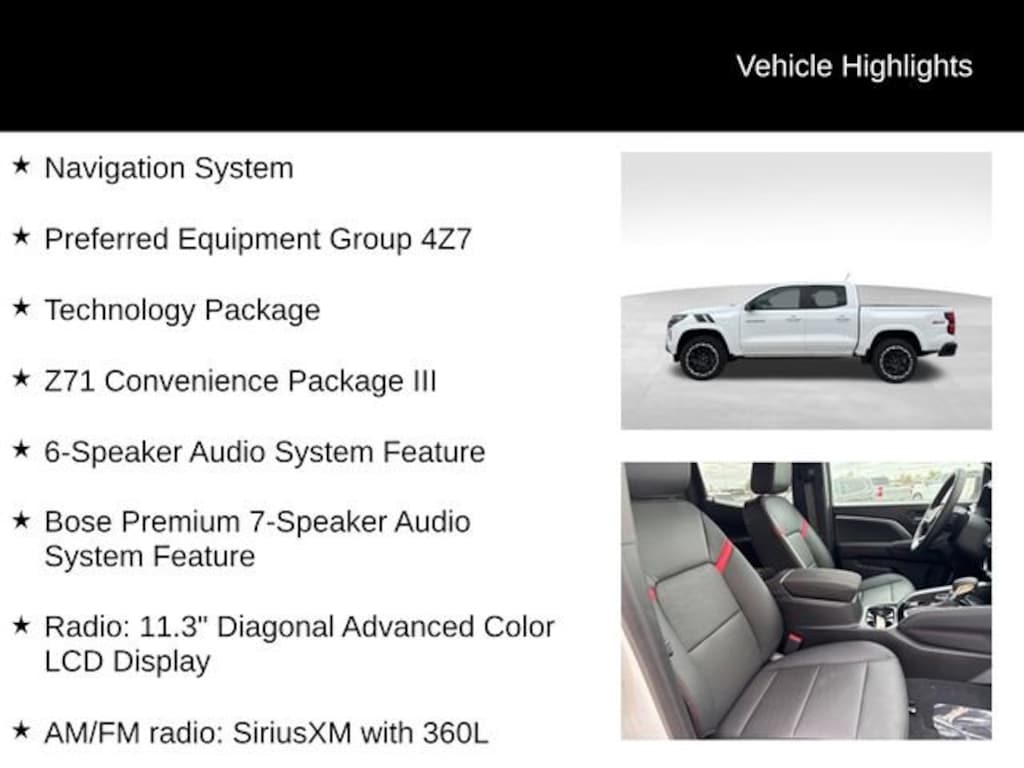 Factory MSRP: $52,135 $5,051 off MSRP! 4-Way Manual Passenger Seat Adjuster, 6-Speaker Audio System Feature, 8-Way Power Driver Seat Adjuster, ABS brakes, Adaptive Cruise Control, Air Conditioning, AM/FM radio: SiriusXM with 360L, Apple CarPlay/Android Auto, Auto-dimming Rear-View mirror, Automatic Emergency Braking, Bose Premium 7-Speaker Audio System Feature, Brake assist, Chevy Safety Assist, Cloth/Evotex Seat Trim, Driver Memory Settings, Driver Seatback Map Pocket, Dual front side impact airbags, Electronic Stability Control, Emergency communication system: OnStar, Following Distance Indicator, Forward Collision Alert, Front Center Armrest, Front dual zone A/C, Front reading lights, HD Surround Vision, Heated door mirrors, Heated front seats, Heated Steering Wheel, Illuminated entry, Navigation System, Outside temperature display, Perforated Leather-Appointed Seat Trim, Power door mirrors, Power driver seat, Power steering, Preferred Equipment Group 4Z7, Radio: 11.3 Diagonal Advanced Color LCD Display, Rear Center Armrest, Rear Pedestrian Alert, Remote keyless entry, Steering Wheel Mounted Audio Controls, Tachometer, Technology Package, Tilt steering wheel, Wheels: 18 x 8.5 Android Dark Full Gloss Aluminum, Wireless Phone Projection, Z71 Convenience Package III.