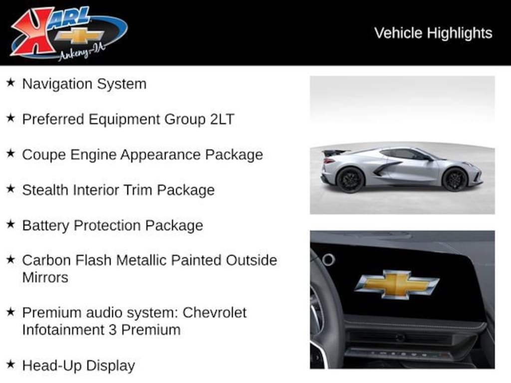 COME VIEW IN CLIMATE CONTROLLED AREA! PURCHASE AND WE WILL STORE IT UNTIL SPRING! Factory MSRP: $90,174 $5,731 off MSRP! 2 Cargo Nets, Battery Protection Package, Carbon Flash Metallic Painted Outside Mirrors, Carbon Flash Metallic-Painted Outside Mirrors, Coupe Engine Appearance Package, Driver Power Bolster Seat Adjuster, Electrical Theft Deterrent System, Engine Lighting, Front Bucket Seats, Front Center Armrest, Front License Plate Bracket, Head-Up Display, Heated Steering Wheel, Navigation System, Passenger Power Bolster Seat Adjuster, Power Driver Lumbar Control Seat Adjuster, Power Passenger Lumbar Control Seat Adjuster, Power passenger seat, Power-Adjustable Outside Heated Mirrors, Preferred Equipment Group 2LT, Premium audio system: Chevrolet Infotainment 3 Premium, Rear Cross Traffic Alert, Side Blind Zone Alert, Stealth Interior Trim Package, Universal Home Remote, Vehicle Inclination Theft Deterrent Sensor, Vehicle Interior Movement Theft Deterrent Sensor, Ventilated front seats, Wireless Phone Charging.