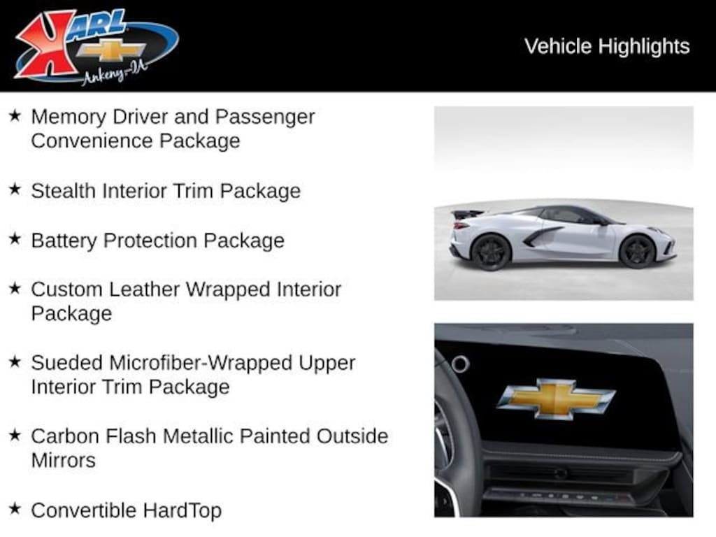 At Karl Chevrolet, we are excited to offer you this exceptional 2026 Chevrolet Corvette Stingray. Experience the thrill of owning one of the most iconic sports cars on the market today. Call us at (515) 299-4300 to schedule a test drive and discover the true power and sophistication of the Corvette Stingray.