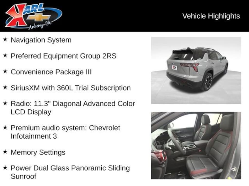 Factory MSRP: $40,040 25/29 City/Highway MPG AWD, 2-Way Power Driver Lumbar Control Seat Adjuster, Convenience Package III, Driver 8-Way Power Seat Adjuster, Evotex Seat Trim, Front Bucket Seats, Front Center Armrest, Front Passenger 2-Way Power Lumbar Seat Adjuster, Front Passenger 4-Way Manual Seat Adjuster, Front Passenger 8-Way Power Seat Adjuster, Heated Driver and Front Passenger Seats, Heated Rear Outboard Seating Positions, Memory Settings, Navigation System, Power Dual Glass Panoramic Sliding Sunroof, Power Liftgate, Preferred Equipment Group 2RS, Premium audio system: Chevrolet Infotainment 3, Radio: 11.3 Diagonal Advanced Color LCD Display, SiriusXM with 360L Trial Subscription, Split folding rear seat, Ventilated Driver Seat, Ventilated Front Passenger Seat, Wheels: 19 Carbon Flash Metallic Aluminum.