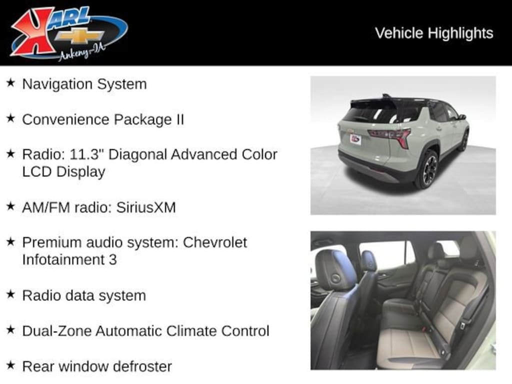 Factory MSRP: $36,585 $3,533 off MSRP! 24/29 City/Highway MPG AWD, 2-Way Power Driver Lumbar Control Seat Adjuster, Air Conditioning, AM/FM radio: SiriusXM, Auto High-beam Headlights, Brake assist, Cloth Seat Trim, Compass, Convenience Package II, Driver 8-Way Power Seat Adjuster, Driver vanity mirror, Dual front impact airbags, Dual front side impact airbags, Dual-Zone Automatic Climate Control, Electronic Stability Control, Emergency communication system: OnStar and Chevrolet connected services capable, Evotex Seat Trim, Front Center Armrest, Front Fog Lamps, Front Passenger 4-Way Manual Seat Adjuster, HD Surround Vision, Heated door mirrors, Heated steering wheel, Heated Wiper Park, Intermittent Front Rain-Sensing Wipers, Low tire pressure warning, Mosaic Black Metallic Roof, Mosaic Black Mirror Caps, Navigation System, Occupant sensing airbag, Outside temperature display, Overhead Sunglass Storage, Power steering, Premium audio system: Chevrolet Infotainment 3, Programmable Universal Home Remote, Radio data system, Radio: 11.3 Diagonal Advanced Color LCD Display, Rear Camera Mirror Washer, Rear Pedestrian Alert, Rear window defroster, Rear window wiper, Remote keyless entry, Speed-sensing steering, Tachometer, Telescoping steering wheel, Traffic Sign Recognition, Wheels: 17 Grazen Metallic Machined-Face Aluminum.
