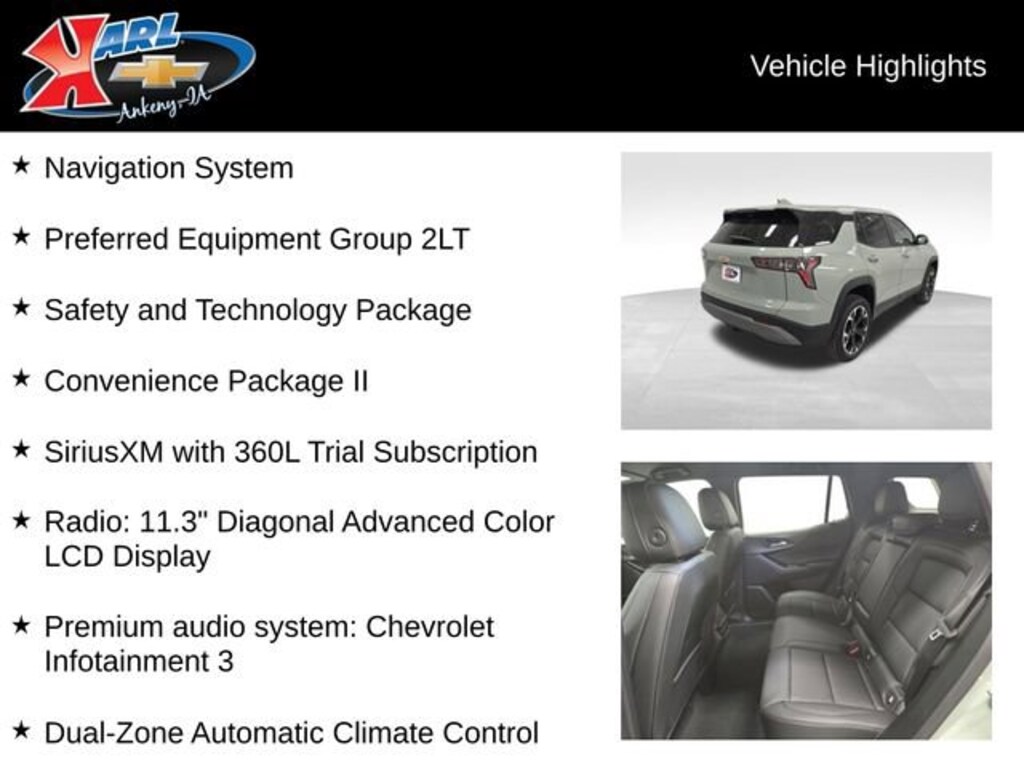 Stepping inside, you'll be greeted by a wealth of cutting-edge technologies, including a state-of-the-art navigation system, a premium audio system, and wireless phone charging. The Equinox also boasts dual-zone automatic climate control, a hands-free programmable power liftgate, and a surround-view camera system, ensuring your driving experience is both comfortable and convenient.