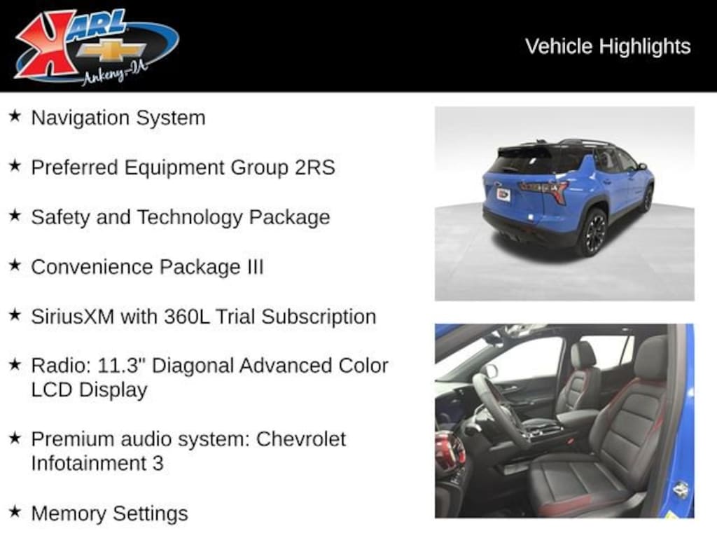 At Karl Chevrolet we want to help you find the best new or used car in Ankeny that suits your needs. When you buy a new car at Karl Chevrolet you know you're finding a vehicle you can rely on. We have a great selection of Platinum Quality Pre-Owned Vehicles. We also pride ourselves in creating a friendly atmosphere and a reliable Dealership that you can trust. Call us and our experts will be glad to help you! (515) 299-4300. *Equipment and options are generated by a 3rd party vendor, exact vehicle options may vary. Please see a salesperson for complete details and vehicle information.