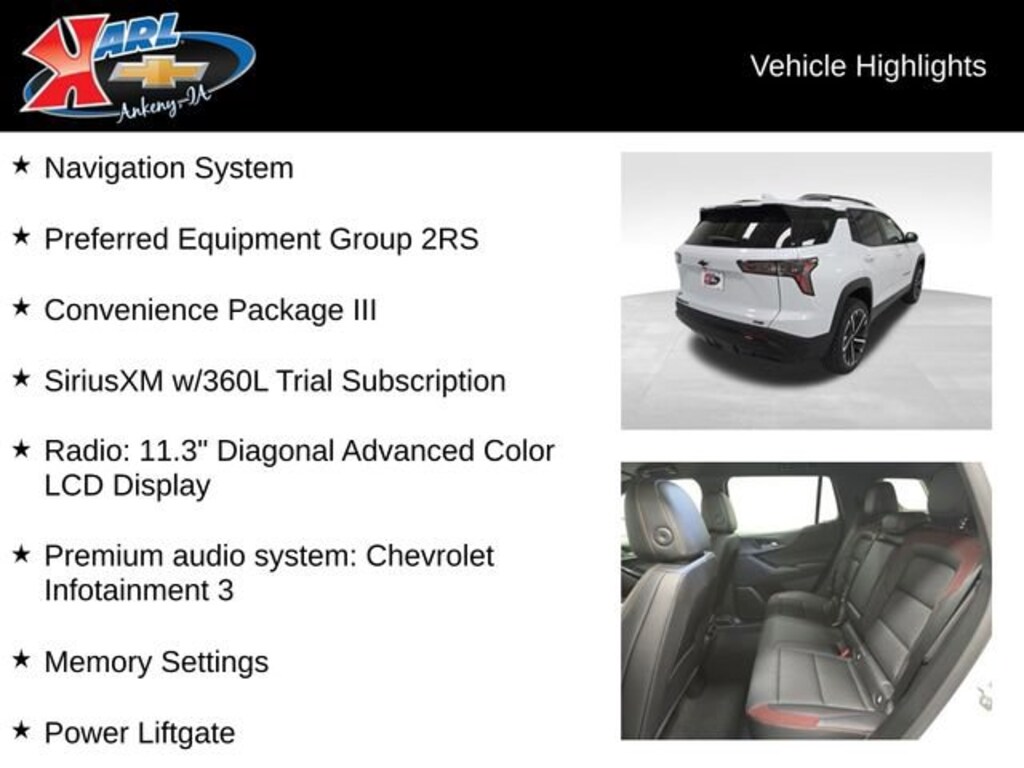 Factory MSRP: $39,840 24/29 City/Highway MPG AWD, 2-Way Power Driver Lumbar Control Seat Adjuster, Convenience Package III, Driver 8-Way Power Seat Adjuster, Evotex Seat Trim, Front Bucket Seats, Front Center Armrest, Front Passenger 2-Way Power Lumbar Seat Adjuster, Front Passenger 4-Way Manual Seat Adjuster, Front Passenger 8-Way Power Seat Adjuster, Heated Driver & Front Passenger Seats, Heated Rear Outboard Seating Positions, Memory Settings, Navigation System, Power Liftgate, Preferred Equipment Group 2RS, Premium audio system: Chevrolet Infotainment 3, Radio: 11.3 Diagonal Advanced Color LCD Display, SiriusXM w/360L Trial Subscription, Split folding rear seat, Ventilated Driver Seat, Ventilated Front Passenger Seat, Wheels: 20 Black Machined-Face Aluminum.