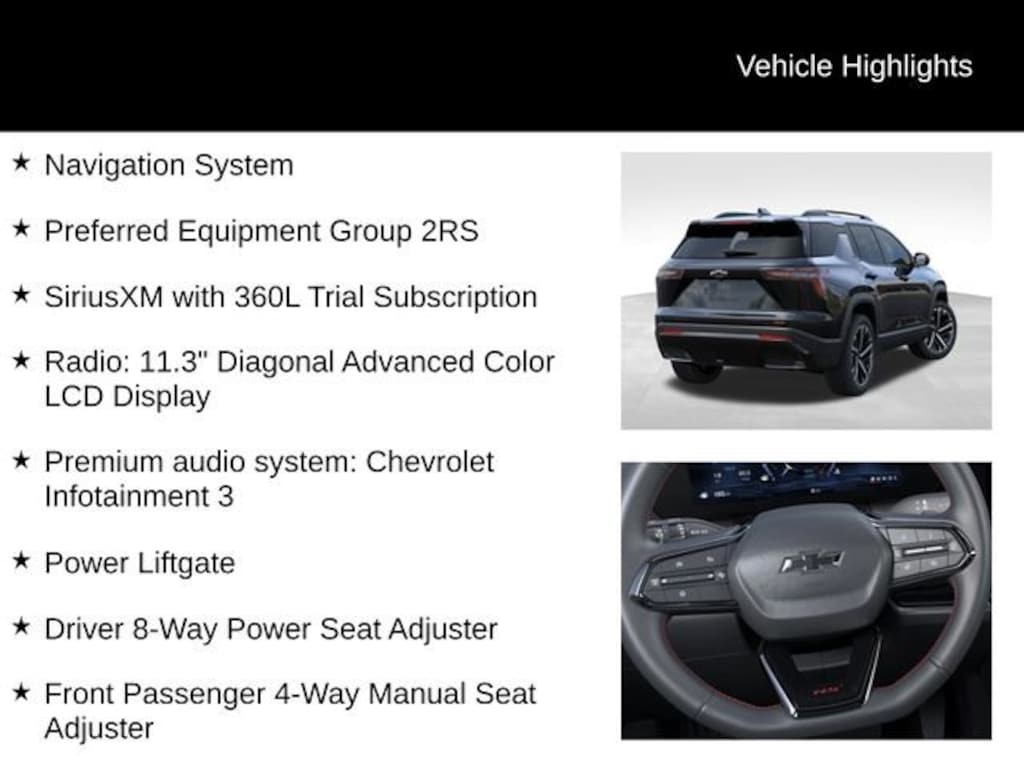 Step inside the Equinox RS and you'll be greeted by a wealth of premium features that cater to your every need. The advanced Chevrolet Infotainment 3 system with an 11.3 diagonal display, SiriusXM with 360L, and a premium audio system provide seamless connectivity and entertainment. The power liftgate and navigation system add convenience, while the heated front seats, ventilated front seats, and heated rear outboard seats ensure year-round comfort.