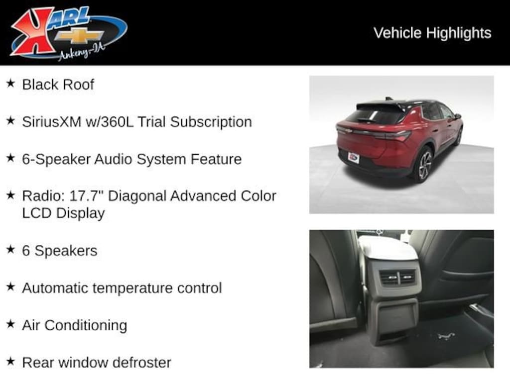 Factory MSRP: $47,585 $5,910 off MSRP! 117/100 City/Highway MPG 19 Wheels, 6 Speakers, 6-Speaker Audio System Feature, 8-Way Power Driver Seat Adjuster, ABS brakes, Air Conditioning, Auto High-beam Headlights, Automatic temperature control, Black Roof, Brake assist, Bumpers: body-color, Delay-off headlights, Driver door bin, Dual front side impact airbags, Electric Drive Unit, Electronic Stability Control, Emergency communication system: OnStar and Chevrolet connected services capable, Evotex Seat Trim, Front Bucket Seats, Front Center Armrest, Front Electric AWD, Front Passenger 4-Way Manual Seat Adjuster, Front reading lights, Heated door mirrors, Heated Driver & Fr Passenger Seats Cushion & Seatback, Heated steering wheel, Occupant sensing airbag, Overhead airbag, Overhead console, Power door mirrors, Power Liftgate, Power steering, Power windows, Radio: 17.7 Diagonal Advanced Color LCD Display, Rear seat center armrest, Rear window defroster, Rear window wiper, Remote keyless entry, SiriusXM w/360L Trial Subscription, Speed control, Telescoping steering wheel, Traction control.