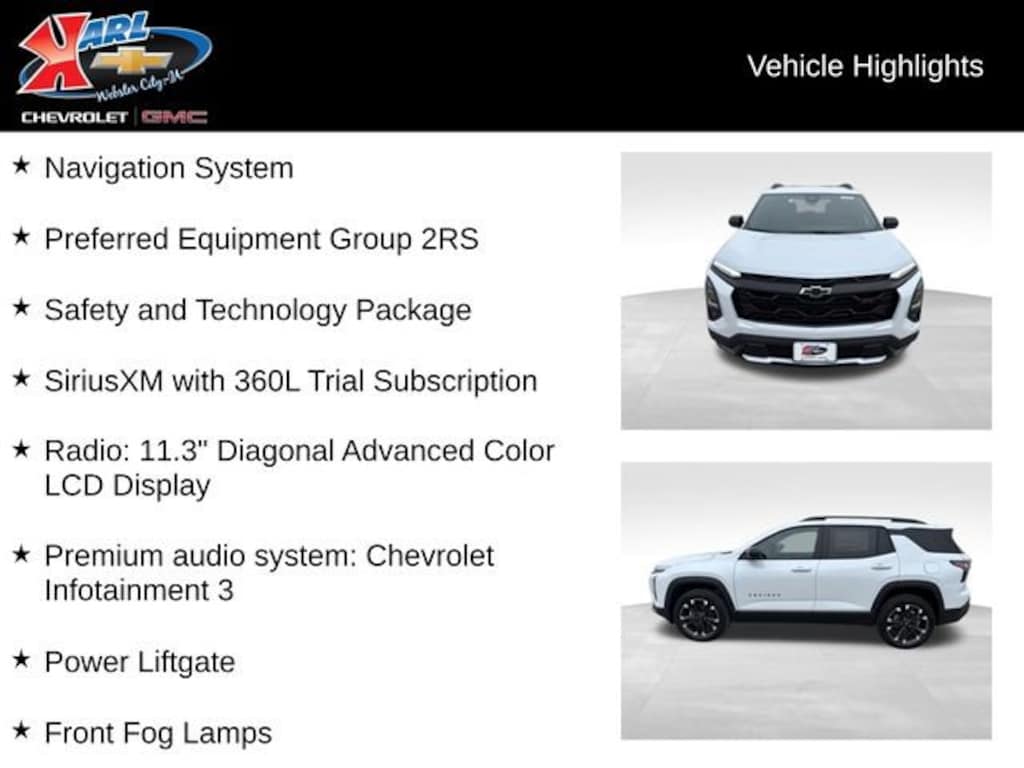 At Karl Chevrolet/GMC we want to help you find the best new or used car in Webster City that suits your needs. When you buy a new car at Karl Chevrolet/GMC you know you're finding a vehicle you can rely on. We have a great selection of CarBravo Quality Pre-Owned Vehicles. We also pride ourselves in creating a friendly atmosphere and a reliable Dealership that you can trust. Call us and our experts will be glad to help you! (515) 209-7117. *Equipment and options are generated by a 3rd party vendor, exact vehicle options may vary. Please see a salesperson for complete details and vehicle information. Price includes $399 dealer added accessories.