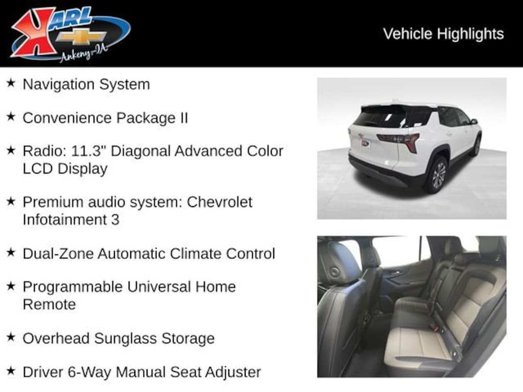 Factory MSRP: $34,545 $709 off MSRP! 24/29 City/Highway MPG AWD, 2-Way Power Driver Lumbar Control Seat Adjuster, Convenience Package II, Driver 6-Way Manual Seat Adjuster, Driver 8-Way Power Seat Adjuster, Dual-Zone Automatic Climate Control, Evotex Seat Trim, Front Bucket Seats, Front Center Armrest, Front Passenger 4-Way Manual Seat Adjuster, Heated Wiper Park, Intermittent Front Rain-Sensing Wipers, Navigation System, Overhead Sunglass Storage, Premium audio system: Chevrolet Infotainment 3, Programmable Universal Home Remote, Radio: 11.3 Diagonal Advanced Color LCD Display, Split folding rear seat, Wheels: 17 Grazen Metallic Machined-Face Aluminum.
