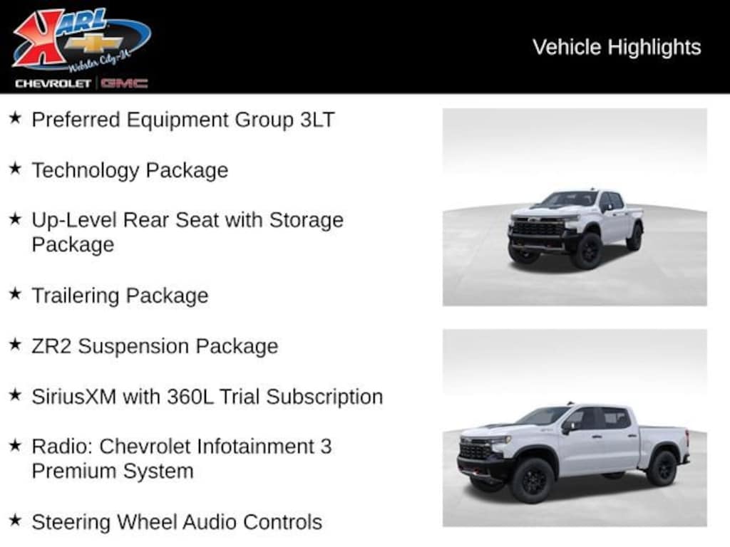 Conquer the toughest terrain with confidence, thanks to the ZR2's robust 3.0L I6 engine, 10-speed automatic transmission, and legendary 4WD system. The ZR2 Suspension Package, Trailering Package, and Chevytec Spray-on Black Bedliner ensure you're ready for any adventure. Enhance your driving experience with the Preferred Equipment Group 3LT, Technology Package, and Up-Level Rear Seat with Storage Package.