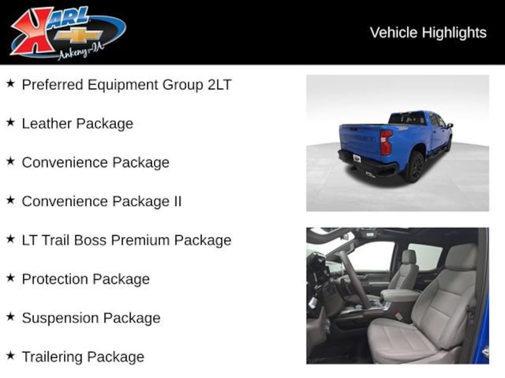 Boasting a striking Blue exterior, the Silverado 1500 LT Trail Boss commands attention wherever it goes. The rugged good looks are complemented by a host of advanced features, including a power tailgate, heated and power-adjustable mirrors, and LED cargo area lighting, ensuring your every need is met with ease.