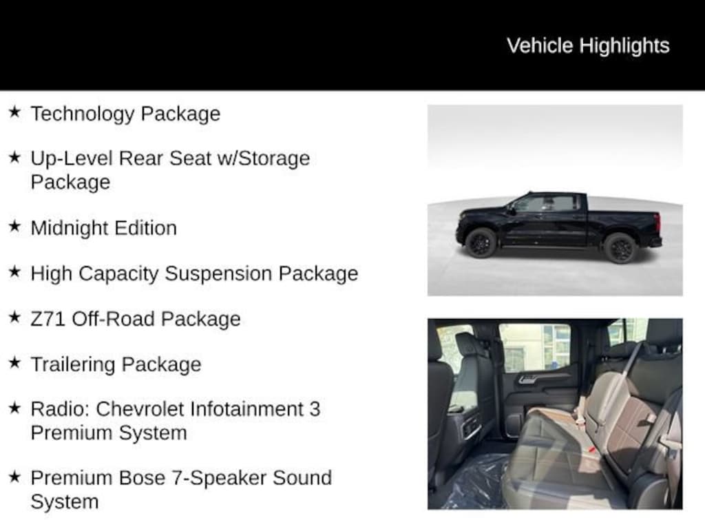 Factory MSRP: $74,175 $5,810 off MSRP! 10-Way Power Driver Seat w/Lumbar, 10-Way Power Passenger Seat Adjuster w/Lumbar, 12.3 Multicolor Reconfigurable Digital Display, 15 Diagonal Multicolor Head-Up Display, 2nd Row Heated Outboard Seats, Apple CarPlay/Android Auto, Black Body Side Moldings, Black Door Handles, Black Dual Exhaust Tips, Black Grille, Black Mirror Caps, Black Power-Retractable Assist Steps, Bodyside moldings, Bumpers: body-color, Chevytec Spray-On Black Bedliner, Chrome Assist Steps, Dark Headlamp Bezel, Dual Exhaust w/Polished Outlets, Electronic Transmission Range Selector Shifter, Front Bucket Seats, Front Center Armrest, Front Frame-Mounted Black Recovery Hooks, Front LED Fog Lamps, Galvano Silver Painted Mirror Caps, Heated door mirrors, Heated Driver & Front Outboard Passenger Seats, Heated rear seats, Heavy-Duty Air Filter, High Capacity Suspension Package, Hill Descent Control, Hitch Guidance, IntelliBeam Automatic High Beam On/Off, LED Cargo Area Lighting, Midnight Edition, Multi-Flex Tailgate, Off-Road Suspension, Outside Heated Power-Adjustable Mirrors, Perforated Leather Seat Trim, Power passenger seat, Power Sunroof, Power Tailgate, Premium audio system: Chevrolet Infotainment 3 Premium, Premium Bose 7-Speaker Sound System, Radio: Chevrolet Infotainment 3 Premium System, Rear Camera Mirror, Split folding rear seat, Technology Package, Trailering Package, Up-Level Rear Seat w/Storage Package, Ventilated Driver & Front Passenger Seats, Wheels: 20 x 9 High Gloss Black Painted Alum, Z71 Off-Road Package.