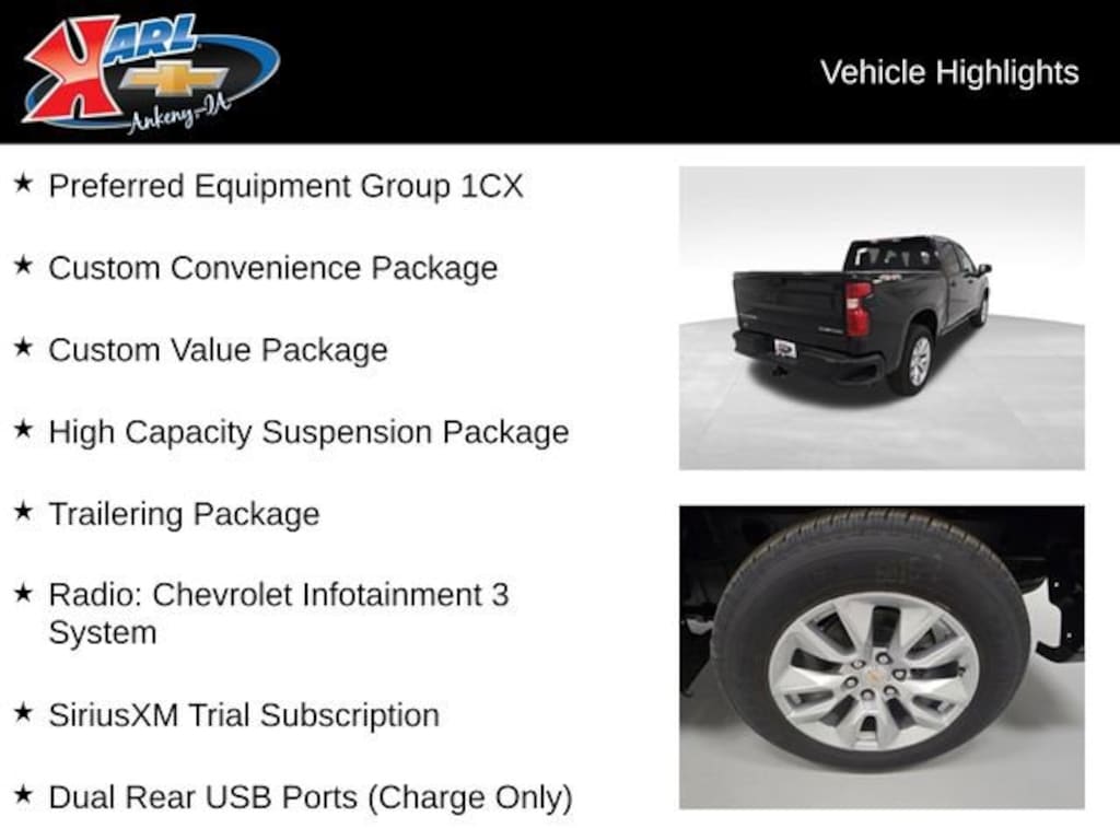 Factory MSRP: $49,890 $5,020 off MSRP! 8-Speed Automatic, 4WD, Black Cloth, 10-Way Power Driver Seat w/Lumbar, 120-Volt Bed Mounted Power Outlet, 120-Volt Interior Power Outlet, 3.5 Monochromatic Display Driver Info Center, 40/20/40 Front Split-Bench Seat, 6-Speaker Audio System, Apple CarPlay/Android Auto, Bluetooth® For Phone, Bumpers: body-color, Chevytec Spray-On Black Bedliner, Color-Keyed Carpeting Floor Covering, Custom Convenience Package, Custom Value Package, Deep-Tinted Glass, Dual Rear USB Ports (Charge Only), Electric Rear-Window Defogger, Electronic Cruise Control, EZ Lift Power Lock & Release Tailgate, Front Frame-Mounted Black Recovery Hooks, Front License Plate Kit, Front Rubberized Vinyl Floor Mats, HD Rear Vision Camera, Heated door mirrors, High Capacity Suspension Package, Hitch Guidance, IntelliBeam Automatic High Beam On/Off, LED Cargo Area Lighting, Manual Tilt Wheel Steering Column, OnStar Services Capable, Power Front Windows w/Driver Express Up/Down, Power Front Windows w/Passenger Express Down, Power Rear Windows w/Express Down, Preferred Equipment Group 1CX, Premium audio system: Chevrolet Infotainment 3, Radio: Chevrolet Infotainment 3 System, Rear 60/40 Folding Bench Seat (Folds Up), Rear Rubberized-Vinyl Floor Mats, Remote Keyless Entry, Remote Vehicle Starter System, SiriusXM Trial Subscription, Split folding rear seat, Standard Tailgate, Teen Driver, Theft Deterrent System (Unauthorized Entry), Tire Pressure Monitoring System, Trailering Package, Wheels: 20 x 9 Bright Silver Painted Aluminum, Wi-Fi Hot Spot Capable.