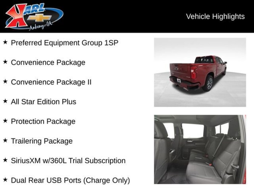 Factory MSRP: $64,925 $9,037 off MSRP! 10-Speed Automatic, 4WD, Black Cloth, 10-Way Power Driver Seat w/Lumbar, 12.3 Multicolor Reconfigurable Digital Display, 120-Volt Bed Mounted Power Outlet, 120-Volt Interior Power Outlet, 220 Amp Alternator, 6-Speaker Audio System, All Star Edition Plus, All-Star Edition, All-Weather Floor Liner (LPO) (AAK), Auto-Locking Rear Differential, Bluetooth® For Phone, Chevytec Spray-On Black Bedliner, Color-Keyed Carpeting Floor Covering, Convenience Package, Convenience Package II, Deep-Tinted Glass, Dual Exhaust w/Polished Outlets, Dual front impact airbags, Dual front side impact airbags, Dual Rear USB Ports (Charge Only), Dual-Zone Automatic Climate Control, Electric Rear-Window Defogger, Electronic Cruise Control, Emergency communication system: OnStar, Engine Block Heater, EZ Lift Power Lock & Release Tailgate, Following Distance Indicator, Forward Collision Alert, Front Frame-Mounted Black Recovery Hooks, Front LED Fog Lamps, Front Pedestrian Braking, Front Rubberized Vinyl Floor Mats, HD Rear Vision Camera, Heated door mirrors, Heated Driver & Front Outboard Passenger Seats, Heated Power-Adjustable Outside Mirrors, Heated Steering Wheel, Heavy-Duty Air Filter, High Gloss Black Mirror Caps, Hill Descent Control, Hitch Guidance, Hitch Guidance w/Hitch View, In-Vehicle Trailering System App, Inside Rear-View Mirror w/Tilt, Integrated Trailer Brake Controller, Keyless Open & Start, LED Cargo Area Lighting, Manual Tilt/Telescoping Steering Column, OnStar Services Capable, Outside temperature display, Overhead console, Power Front Windows w/Driver Express Up/Down, Power Front Windows w/Passenger Express Down, Power Rear Windows w/Express Down, Power Sliding Rear Window w/Rear Defogger, Preferred Equipment Group 1SP, Premium Bose 7-Speaker Sound System, Protection Package, Rear 60/40 Folding Bench Seat (Folds Up), Rear Rubberized-Vinyl Floor Mats, Rear Wheelhouse Liners, Remote Vehicle Starter System, SiriusXM w/360L Trial Subscription, Standard Tailgate, Steering Wheel Audio Controls, Teen Driver, Theft Deterrent System (Unauthorized Entry), Tire Pressure Monitoring System, Trailering Package, Universal Home Remote, Wheels: 20 x 9 Painted Aluminum, Wi-Fi Hot Spot Capable, Wrapped Steering Wheel.
