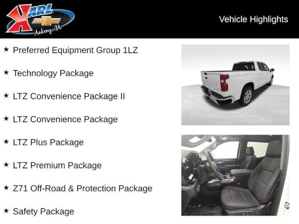 Factory MSRP: $69,075 $4,500 off MSRP! 10-Speed Automatic, 4WD, Black Leather, 10-Way Power Driver Seat w/Lumbar, 10-Way Power Passenger Seat Adjuster w/Lumbar, 12.3 Multicolor Reconfigurable Digital Display, 120-Volt Bed Mounted Power Outlet, 120-Volt Interior Power Outlet, 15 Diagonal Multicolor Head-Up Display, 2 USB Data Ports, 2nd Row Heated Outboard Seats, Adaptive Cruise Control, All-Weather Floor Liner (LPO) (AAK), Apple CarPlay/Android Auto, Auto High-beam Headlights, Auto-dimming door mirrors, Auto-Dimming Inside Rear-View Mirror, Auto-Locking Rear Differential, Bed View Camera, Bluetooth® For Phone, Brake assist, Chevytec Spray-On Black Bedliner, Chrome Mirror Caps, Color-Keyed Carpeting Floor Covering, Deep-Tinted Glass, Driver Memory, Dual Exhaust w/Black Exhaust Tips, Dual front impact airbags, Dual front side impact airbags, Dual Rear USB Ports (Charge Only), Electric Rear-Window Defogger, Electronic Cruise Control, Electronic Stability Control, Emergency communication system: OnStar, EZ Lift Power Lock & Release Tailgate, Floor Mounted Center Console, Following Distance Indicator, Front Bucket Seats, Front Center Armrest, Front Frame-Mounted Black Recovery Hooks, Front LED Fog Lamps, Front License Plate Kit, Front Rain-Sensing Wipers, Front reading lights, Front Rubberized Vinyl Floor Mats, Front wheel independent suspension, HD Surround Vision, Heated door mirrors, Heated Driver & Front Outboard Passenger Seats, Heated front seats, Heated Steering Wheel, Heated steering wheel, Heavy-Duty Air Filter, High Capacity Suspension Package, Hill Descent Control, Hitch Guidance, Hitch Guidance w/Hitch View, In-Vehicle Trailering System App, Integrated Trailer Brake Controller, Keyless Open & Start, LED Cargo Area Lighting, LTZ Convenience Package, LTZ Convenience Package II, LTZ Plus Package, LTZ Premium Package, Memory seat, Off-Road Suspension, OnStar Services Capable, Outside Heated Power-Adjustable Mirrors, Perimeter Lighting, Power Front Passenger Windows w/Express Up/Down, Power Front Windows w/Driver Express Up/Down, Power passenger seat, Power Rear Windows w/Express Down, Power Sliding Rear Window w/Rear Defogger, Power steering, Power Sunroof, Power Tailgate, Power Tilt & Telescoping Steering Column, Preferred Equipment Group 1LZ, Premium Bose 7-Speaker Sound System, Rain sensing wipers, Rear Camera Mirror, Rear Cross Traffic Braking, Rear Pedestrian Alert, Rear Rubberized-Vinyl Floor Mats, Rear Wheelhouse Liners, Remote Vehicle Starter System, Safety Alert Seat, Safety Package, SiriusXM w/360L Trial Subscription, Standard Tailgate, Steering Wheel Audio Controls, Technology Package, Teen Driver, Theft Deterrent System (Unauthorized Entry), Tire Pressure Monitoring System, Trailer Camera Provisions, Trailer Side Blind Zone Alert, Trailering Package, Ultrasonic Front & Rear Park Assist, Universal Home Remote, Up-Level Rear Seat w/Storage Package, Ventilated Driver & Front Passenger Seats, Wheels: 20 x 9 Sterling Silver Painted Aluminum, Wi-Fi Hot Spot Capable, Wireless Charging, Wrapped Steering Wheel, Z71 Off-Road & Protection Package, Z71 Off-Road Package.