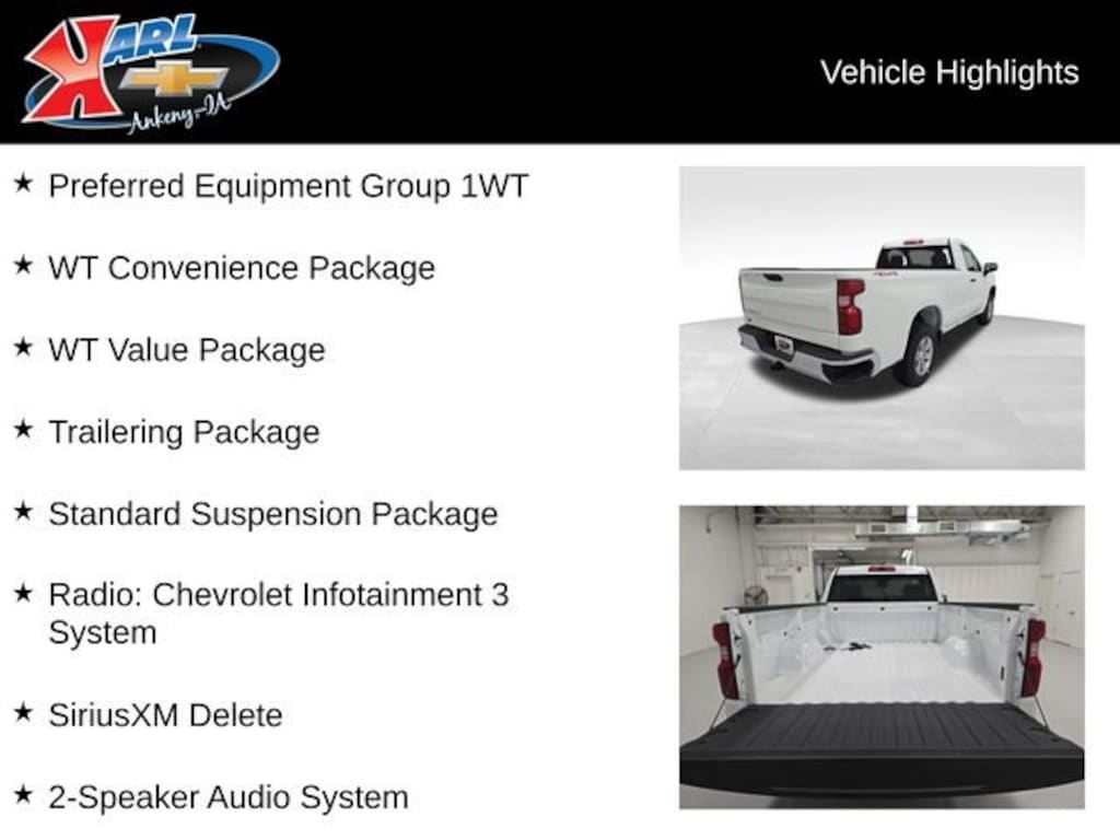 Factory MSRP: $47,550 $3,245 off MSRP! 10-Speed Automatic, 4WD, Jet Black Vinyl, 2-Speaker Audio System, 3.5 Monochromatic Display Driver Info Center, 4-Way Manual Driver Seat Adjuster, 40/20/40 Front Split Bench Seat, Apple CarPlay/Android Auto, Black (Semi-Gloss) Front Bumper, Black (Semi-Gloss) Rear Bumper, Bluetooth® For Phone, Deep-Tinted Glass, Electric Rear-Window Defogger, Electronic Cruise Control, Front Frame-Mounted Black Recovery Hooks, HD Rear Vision Camera, Heated Power-Adjustable Outside Mirrors, Hitch Guidance, Inside Rear-View Mirror w/Tilt, Locking Tailgate, Manual Tailgate Function w/No EZ Lift, Manual Tilt Wheel Steering Column, OnStar Services Capable, Power Front Windows w/Driver Express Up/Down, Power Front Windows w/Passenger Express Down, Preferred Equipment Group 1WT, Radio: Chevrolet Infotainment 3 System, Remote Keyless Entry, Rubberized-Vinyl Floor Covering, SiriusXM Delete, Solar Absorbing Tinted Glass, Standard Suspension Package, Standard Tailgate, Teen Driver, Tire Pressure Monitoring System, Trailering Package, Vinyl Seat Trim, Wheels: 17 x 8 Ultra Silver Painted Steel, Wi-Fi Hot Spot Capable, WT Convenience Package, WT Value Package.Summit White 2026 Chevrolet Silverado 1500 WT 2D Standard Cab EcoTec3 5.3L V8 10-Speed Automatic 4WD Price includes: $1000 - GM Bonus Cash. Exp. 11/03/2025 $2000 - Chevrolet Consumer Cash Program. Exp. 11/03/2025