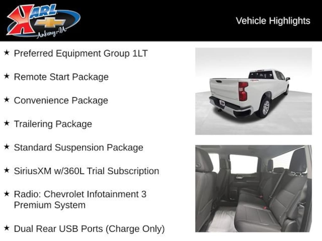 Factory MSRP: $58,590 $8,279 off MSRP! Priced below KBB Fair Purchase Price! 10-Speed Automatic, 4WD, Jet Blk Clth Cloth, 10-Way Power Driver Seat w/Lumbar, 12.3 Multicolor Reconfigurable Digital Display, 120-Volt Bed Mounted Power Outlet, 120-Volt Interior Power Outlet, 40/20/40 Front Split-Bench Seat, 6-Speaker Audio System, All-Star Edition, Apple CarPlay/Android Auto, Auto-Locking Rear Differential, Bluetooth® For Phone, Bumpers: chrome, Chrome Mirror Caps, Color-Keyed Carpeting Floor Covering, Convenience Package, Deep-Tinted Glass, Dual Rear USB Ports (Charge Only), Dual-Zone Automatic Climate Control, Electric Rear-Window Defogger, Electronic Cruise Control, EZ Lift Power Lock & Release Tailgate, Front Frame-Mounted Black Recovery Hooks, Front Rubberized Vinyl Floor Mats, HD Rear Vision Camera, Heated door mirrors, Heated Driver & Front Outboard Passenger Seats, Heated Power-Adjustable Outside Mirrors, Heated Steering Wheel, Hitch Guidance, Inside Rear-View Mirror w/Tilt, Integrated Trailer Brake Controller, IntelliBeam Automatic High Beam On/Off, Keyless Open & Start, LED Cargo Area Lighting, Manual Tilt/Telescoping Steering Column, OnStar Services Capable, Power Front Windows w/Driver Express Up/Down, Power Front Windows w/Passenger Express Down, Power Rear Windows w/Express Down, Preferred Equipment Group 1LT, Premium audio system: Chevrolet Infotainment 3 Premium, Radio: Chevrolet Infotainment 3 Premium System, Rear 60/40 Folding Bench Seat (Folds Up), Rear Rubberized-Vinyl Floor Mats, Remote Start Package, Remote Vehicle Starter System, SiriusXM w/360L Trial Subscription, Split folding rear seat, Standard Suspension Package, Standard Tailgate, Steering Wheel Audio Controls, Teen Driver, Theft Deterrent System (Unauthorized Entry), Tire Pressure Monitoring System, Trailering Package, Wheels: 18 x 8.5 Bright Silver Painted Aluminum, Wi-Fi Hot Spot Capable, Wrapped Steering Wheel.Summit White 2026 Chevrolet Silverado 1500 LT 4D Crew Cab EcoTec3 5.3L V8 10-Speed Automatic 4WD Price includes: $1500 - Chevrolet Bonus Cash. Exp. 03/02/2026 $3250 - Chevrolet Consumer Cash Program. Exp. 03/02/2026