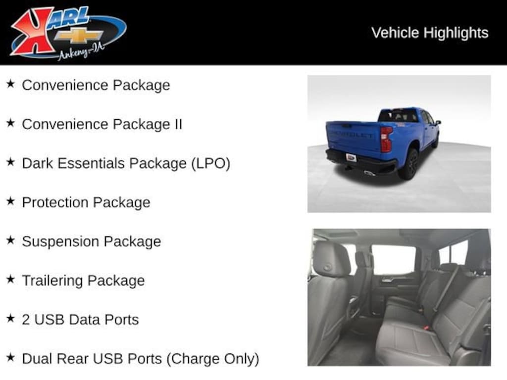 Factory MSRP: $67,485 $6,019 off MSRP! 10-Speed Automatic, 4WD, Black Cloth, 10-Way Power Driver Seat w/Lumbar, 12.3 Multicolor Reconfigurable Digital Display, 120-Volt Bed Mounted Power Outlet, 120-Volt Interior Power Outlet, 2 USB Data Ports, All-Weather Floor Liner (LPO) (AAK), Black Name Plates (LPO), Brake assist, Chevytec Spray-On Black Bedliner, Cloth Seat Trim, Color-Keyed Carpeting Floor Covering, Compass, Convenience Package, Convenience Package II, Dark Essentials Package (LPO), Deep-Tinted Glass, Delay-off headlights, Driver door bin, Dual Rear USB Ports (Charge Only), Dual-Zone Automatic Climate Control, Electric Rear-Window Defogger, Electronic Cruise Control, Electronic Stability Control, Electronic Transmission Range Selector Shifter, Floor Mounted Center Console, Forward Collision Alert, Front Bucket Seats, Front Center Armrest w/Storage, Front fog lights, Front Pedestrian Braking, HD Rear Vision Camera, Heated Driver & Front Outboard Passenger Seats, Heated front seats, Heated Steering Wheel, Heavy-Duty Air Filter, Hill Descent Control, Hitch Guidance, Hitch Guidance w/Hitch View, In-Vehicle Trailering System App, Inside Rear-View Mirror w/Tilt, Integrated Trailer Brake Controller, Keyless Open & Start, Lane Keep Assist w/Lane Departure Warning, LED Cargo Area Lighting, Manual Tilt/Telescoping Steering Column, OnStar Services Capable, Outside temperature display, Power Front Windows w/Driver Express Up/Down, Power Front Windows w/Passenger Express Down, Power Rear Windows w/Express Down, Power Sliding Rear Window w/Rear Defogger, Premium Bose 7-Speaker Sound System, Protection Package, Rear 60/40 Folding Bench Seat (Folds Up), Rear reading lights, Rear Wheelhouse Liners, Rear window defroster, Remote Vehicle Starter System, Single Outlet Exhaust, Standard Tailgate, Suspension Package, Teen Driver, Telescoping steering wheel, Theft Deterrent System (Unauthorized Entry), Trailering Package, Universal Home Remote, Wheels: 20 x 9 High Gloss Black Painted Alum, Wi-Fi Hot Spot Capable, Wireless Charging, Wrapped Steering Wheel.