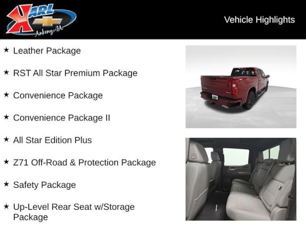 Factory MSRP: $67,280 $5,659 off MSRP! 10-Speed Automatic, 4WD, Gideon/Very Dark Atmosphere Leather, 10-Way Power Driver Seat w/Lumbar, 12.3 Multicolor Reconfigurable Digital Display, 120-Volt Bed Mounted Power Outlet, 120-Volt Interior Power Outlet, 2 USB Data Ports, 6-Speaker Audio System, Adaptive Cruise Control, All Star Edition Plus, All-Star Edition, All-Weather Floor Liner (LPO) (AAK), Apple CarPlay/Android Auto, Bumpers: body-color, Chevytec Spray-On Black Bedliner, Chrome Assist Steps, Convenience Package, Convenience Package II, Dual Exhaust w/Polished Outlets, Dual Rear USB Ports (Charge Only), Dual-Zone Automatic Climate Control, Electric Rear-Window Defogger, Electronic Transmission Range Selector Shifter, Floor Mounted Center Console, Front Bucket Seats, Front LED Fog Lamps, HD Surround Vision, Heated Driver & Front Outboard Passenger Seats, Heated Power-Adjustable Outside Mirrors, Heated Steering Wheel, Heavy-Duty Air Filter, High Capacity Suspension Package, High Gloss Black Mirror Caps, Hill Descent Control, Hitch Guidance, Hitch Guidance w/Hitch View, In-Vehicle Trailering System App, IntelliBeam Automatic High Beam On/Off, Keyless Open & Start, Leather Package, Leather-Appointed Front Seat Trim, LED Cargo Area Lighting, Manual Tilt/Telescoping Steering Column, Off-Road Suspension, Perimeter Lighting, Power door mirrors, Power Sliding Rear Window w/Rear Defogger, Premium audio system: Chevrolet Infotainment 3 Premium, Premium Bose 7-Speaker Sound System, Protection Package, Radio: Chevrolet Infotainment 3 Premium System, Rear 60/40 Folding Bench Seat (Folds Up), Rear Cross Traffic Braking, Rear Pedestrian Alert, Rear Wheelhouse Liners, Remote Vehicle Starter System, RST All Star Premium Package, Safety Package, Split folding rear seat, Standard Suspension Package, Theft Deterrent System (Unauthorized Entry), Trailer Camera Provisions, Trailer Side Blind Zone Alert, Trailering Package, Ultrasonic Front & Rear Park Assist, Universal Home Remote, Up-Level Rear Seat w/Storage Package, Wheels: 20 x 9 Painted Aluminum, Wireless Charging, Wrapped Steering Wheel, Z71 Off-Road & Protection Package, Z71 Off-Road Package.