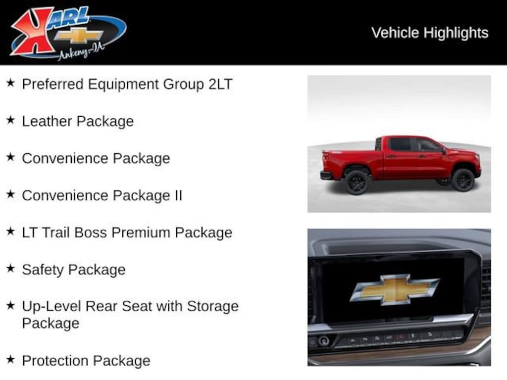 The Silverado LT Trail Boss is packed with features that prioritize both performance and comfort. The 10-speed automatic transmission and 4WD system ensure confident handling, while the Convenience Package and Leather Package elevate the driving experience with luxurious touches like dual-zone automatic climate control, heated front seats, and a premium Bose audio system.