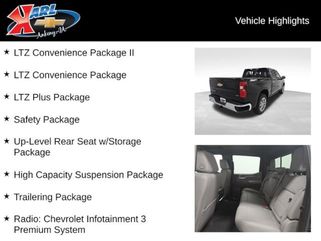 Factory MSRP: $66,045 $4,858 off MSRP! 10-Speed Automatic, 4WD, Gideon/Very Dk Atmosphere Leather, 10-Way Power Driver Seat w/Lumbar, 10-Way Power Passenger Seat Adjuster w/Lumbar, 12.3 Multicolor Reconfigurable Digital Display, 2 USB Data Ports, 2nd Row Heated Outboard Seats, Adaptive Cruise Control, Apple CarPlay/Android Auto, Bumpers: chrome, Chevytec Spray-On Black Bedliner, Chrome Mirror Caps, Electronic Transmission Range Selector Shifter, Floor Mounted Center Console, Front Black Bowtie Emblem (LPO), Front Bucket Seats, Front Center Armrest, Front LED Fog Lamps, HD Surround Vision, Heated door mirrors, Heated Driver & Front Outboard Passenger Seats, High Capacity Suspension Package, Hitch Guidance, Integrated Trailer Brake Controller, IntelliBeam Automatic High Beam On/Off, LED Cargo Area Lighting, LTZ Convenience Package, LTZ Convenience Package II, LTZ Plus Package, Multi-Flex Tailgate, Outside Heated Power-Adjustable Mirrors, Perforated Leather-Appointed Front Seat Trim, Perimeter Lighting, Power passenger seat, Power Sliding Rear Window w/Rear Defogger, Power Tailgate, Power Tilt & Telescoping Steering Column, Premium audio system: Chevrolet Infotainment 3 Premium, Premium Bose 7-Speaker Sound System, Radio: Chevrolet Infotainment 3 Premium System, Rear Cross Traffic Braking, Rear Pedestrian Alert, Safety Alert Seat, Safety Package, Split folding rear seat, Trailer Camera Provisions, Trailer Side Blind Zone Alert, Trailering Package, Ultrasonic Front & Rear Park Assist, Universal Home Remote, Up-Level Rear Seat w/Storage Package, Ventilated Driver & Front Passenger Seats, Wheels: 20 x 9 Sterling Silver Painted Aluminum, Wireless Charging.
