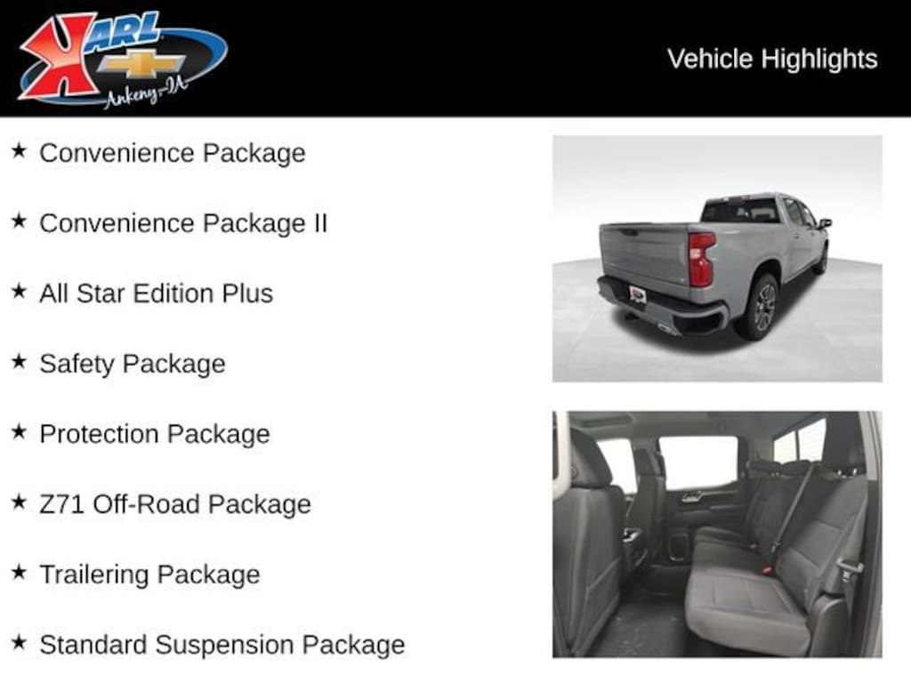 Factory MSRP: $64,550 $5,508 off MSRP! 10-Speed Automatic, 4WD, Black Cloth, 12.3 Multicolor Reconfigurable Digital Display, 120-Volt Bed Mounted Power Outlet, 120-Volt Interior Power Outlet, 2 USB Data Ports, 6 Speakers, 6-Speaker Audio System, Air Conditioning, All Star Edition Plus, All-Star Edition, AM/FM radio: SiriusXM with 360L, Automatic temperature control, Brake assist, Cloth Seat Trim, Color-Keyed Carpeting Floor Covering, Convenience Package, Convenience Package II, Deep-Tinted Glass, Driver vanity mirror, Dual front side impact airbags, Dual-Zone Automatic Climate Control, Electric Rear-Window Defogger, Electronic Cruise Control, Electronic Stability Control, Electronic Transmission Range Selector Shifter, Emergency communication system: OnStar, Floor Mounted Center Console, Forward Collision Alert, Front Bucket Seats, Front dual zone A/C, Front fog lights, Front Frame-Mounted Black Recovery Hooks, Front Pedestrian Braking, HD Rear Vision Camera, HD Surround Vision, Heated door mirrors, Heated front seats, Heated Power-Adjustable Outside Mirrors, Heated Steering Wheel, Heated steering wheel, Heavy-Duty Air Filter, High Gloss Black Mirror Caps, Hill Descent Control, Hitch Guidance, Integrated Trailer Brake Controller, LED Cargo Area Lighting, Manual Tilt/Telescoping Steering Column, Off-Road Suspension, Outside temperature display, Overhead console, Perimeter Lighting, Power driver seat, Power steering, Power windows, Premium Bose 7-Speaker Sound System, Protection Package, Radio: Chevrolet Infotainment 3 Premium System, Rear Cross Traffic Braking, Rear Pedestrian Alert, Rear reading lights, Rear Rubberized-Vinyl Floor Mats, Rear Wheelhouse Liners, Rear window defroster, Remote keyless entry, Remote Vehicle Starter System, Safety Package, Single Outlet Exhaust, Split folding rear seat, Standard Suspension Package, Standard Tailgate, Teen Driver, Telescoping steering wheel, Trailer Camera Provisions, Trailer Side Blind Zone Alert, Trailering Package, Universal Home Remote, Variably intermittent wipers, Wheels: 18 x 8.5 Bright Silver Painted Aluminum, Wheels: 20 x 9 Painted Aluminum, Wi-Fi Hot Spot Capable, Wireless Charging, Wrapped Steering Wheel, Z71 Off-Road Package.