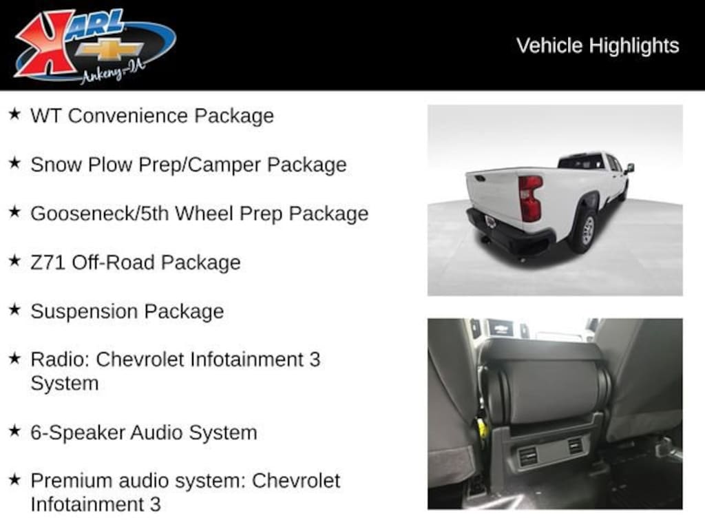 Factory MSRP: $58,200 $4,295 off MSRP! 10-Speed Automatic, 4WD, Black Cloth, 18 Painted Steel Wheels, 220 Amp Alternator, 3.5 Diagonal Monochromatic Display DIC, 6-Speaker Audio System, Apple CarPlay/Android Auto, Auto-Dimming Inside Rear-View Mirror, Black Chevytec Spray-On Bedliner, Black Mirror Caps, Deep-Tinted Glass, Electric Rear-Window Defogger, EZ Lift Power Lock & Release Tailgate, Gooseneck/5th Wheel Prep Package, Heated & Auto-Dimming Vertical Trailering Mirrors, Heated Vertical Trailering Mirrors, High-Visibility Vertical Trailering Mirrors, Hill Descent Control, LED Smoked Amber Roof Marker Lamps, Off-Road Suspension, Premium audio system: Chevrolet Infotainment 3, Radio: Chevrolet Infotainment 3 System, Rear 60/40 Folding Bench Seat (Folds Up), Snow Plow Prep/Camper Package, Split folding rear seat, Suspension Package, Vinyl Seat Trim, WT Convenience Package, Z71 Off-Road Package.Summit White 2026 Chevrolet Silverado 2500HD Work Truck 4D Crew Cab 6.6L V8 10-Speed Automatic 4WD Price includes: $1000 - Chevrolet Consumer Cash Program. Exp. 11/03/2025