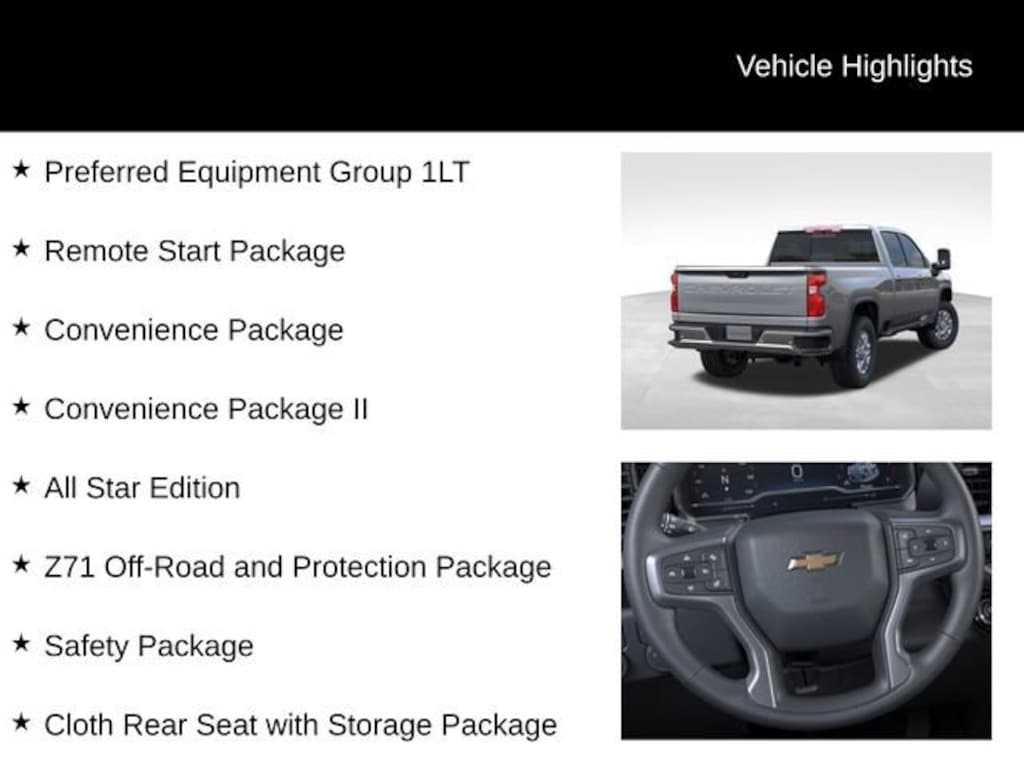 The 2026 Chevrolet Silverado 2500HD LT is a rugged and capable heavy-duty pickup that's ready to take on any task you throw its way. With its powerful 6.6L V8 engine, 10-speed automatic transmission, and 4-wheel drive, this Silverado is built to handle the toughest jobs with ease.- 6.6L V8 Engine- 10-Speed Automatic Transmission- 4-Wheel Drive- All Star Edition- Convenience Package- Suspension Package- Z71 Off-Road and Protection PackageBut this Silverado is more than just a workhorse. It's also packed with premium features that will make your driving experience more comfortable and convenient. The Chevrolet Infotainment 3 Premium system with SiriusXM and wireless charging keeps you connected and entertained, while the heated steering wheel and dual-zone automatic climate control keep you cozy no matter the weather. And with the Bed View Camera and Trailer Camera Provisions, you'll have all the tools you need to tackle even the toughest towing and hauling tasks.Whether you're hauling heavy loads, tackling off-road adventures, or just enjoying a comfortable ride, the 2026 Chevrolet Silverado 2500HD LT is the perfect companion. With its impressive capabilities and premium features, this Silverado is ready to take on any challenge you face.Don't just take our word for it, though. Come in and see for yourself why the 2026 Chevrolet Silverado 2500HD LT is the heavy-duty pickup you've been looking for. Our team of experts is ready to answer any questions you might have and help you find the perfect vehicle to fit your needs.At Karl Chevrolet Stuart we want to help you find the best new or used car in Stuart that suits your needs. When you buy a new car at Karl Chevrolet Stuart you know you're finding a vehicle you can rely on. We have a great selection of CarBravo Quality Pre-Owned Vehicles. We also pride ourselves in creating a friendly atmosphere and a reliable Dealership that you can trust. Call us and our experts will be glad to help you! (515) 523-1201. *Equipment and options are generated by a 3rd party vendor, exact vehicle options may vary. Please see a salesperson for complete details and vehicle information. Price includes: $500 - Chevrolet Consumer Cash Program. Exp. 04/30/2026