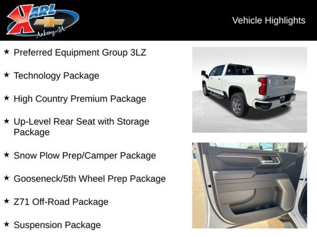 Elevate your driving experience with the all-new 2026 Chevrolet Silverado 2500HD High Country 4WD CREW 159. This powerhouse of a truck is engineered to conquer any terrain, whether you're tackling tough job sites or embarking on thrilling adventures.- Duramax 6.6L V8 Turbodiesel engine delivering an impressive 470 horsepower and an astounding 975 lb-ft of torque- High Country Premium Package with advanced technology features- Z71 Off-Road Package for exceptional off-road capability- Tailgate with six functional load/access features for increased versatility- Snow Plow Prep/Camper Package for seamless integration with your outdoor lifestyleThis Silverado 2500HD is more than just a work truck it's a true companion that will elevate your driving experience. With its premium interior, advanced safety technologies, and uncompromising performance, this vehicle is ready to take on any challenge you face.Imagine the possibilities with features like the Bose premium audio system, wireless charging, and the 15-inch diagonal multicolor head-up display. The heated and ventilated front seats, along with the heated rear seats, will keep you and your passengers comfortable in any weather.Off-road enthusiasts will appreciate the Z71 Off-Road Package, which includes off-road-tuned shocks, hill descent control, and skid plates to conquer the toughest terrain. The Gooseneck/5th Wheel Prep Package and the Snow Plow Prep/Camper Package further enhance the Silverado's versatility, making it the ultimate tool for your outdoor adventures.With its impressive capabilities, premium features, and uncompromising quality, the 2026 Chevrolet Silverado 2500HD High Country 4WD CREW 159 is the ultimate choice for those who demand the best. Experience the power, the comfort, and the confidence that this exceptional truck has to offer.At Karl Chevrolet, we want to help you find the best new or used car in Ankeny that suits your needs. When you buy a new car at Karl Chevrolet, you know you're finding a vehicle you can rely on. We have a great selection of Platinum Quality Pre-Owned Vehicles. We also pride ourselves in creating a friendly atmosphere and a reliable Dealership that you can trust. Call us and our experts will be glad to help you! (515) 299-4300. *Equipment and options are generated by a 3rd party vendor, exact vehicle options may vary. Please see a salesperson for complete details and vehicle information. Price includes: $1500 - Chevrolet Consumer Cash Program. Exp. 03/02/2026