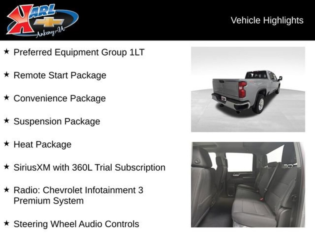 At Karl Chevrolet, we want to help you find the best new or used car in Ankeny that suits your needs. When you buy a new car at Karl Chevrolet, you know you're finding a vehicle you can rely on. We have a great selection of Platinum Quality Pre-Owned Vehicles. We also pride ourselves in creating a friendly atmosphere and a reliable Dealership that you can trust. Call us and our experts will be glad to help you! (515) 299-4300. *Equipment and options are generated by a 3rd party vendor, exact vehicle options may vary. Please see a salesperson for complete details and vehicle information. Price includes: $500 - Chevrolet Consumer Cash Program. Exp. 03/31/2026
