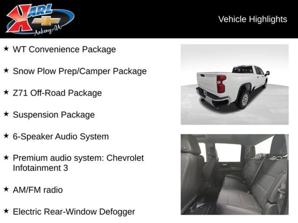 Factory MSRP: $56,710 $2,000 off MSRP! 10-Speed Automatic, 4WD, Jet Blk Vinyl, 220 Amp Alternator, 6-Speaker Audio System, Air Conditioning, AM/FM radio, Black Front Bumper, Black Rear Bumper, Brake assist, Chevrolet Connected Access Capable, Chrome Front Bumper, Compass, Deep-Tinted Glass, Delay-off headlights, Dual front impact airbags, Electric Rear-Window Defogger, Emergency communication system: OnStar, Front anti-roll bar, Front reading lights, Front wheel independent suspension, Heated Vertical Trailering Mirrors, High-Visibility Vertical Trailering Mirrors, Hill Descent Control, LED Smoked Amber Roof Marker Lamps, Locking Tailgate, Occupant sensing airbag, Off-Road Suspension, OnStar Services Capable, Outside temperature display, Overhead airbag, Power Door Locks, Power steering, Power windows, Premium audio system: Chevrolet Infotainment 3, Push Button Start, Rear reading lights, Rear step bumper, Remote keyless entry, Rubberized-Vinyl Floor Covering, Snow Plow Prep/Camper Package, Split folding rear seat, Standard Tailgate, Suspension Package, Tilt steering wheel, Wheels: 17 Silver Painted Steel, Wi-Fi Hotspot Capable, Wireless Phone Projection, WT Convenience Package, Z71 Off-Road Package.