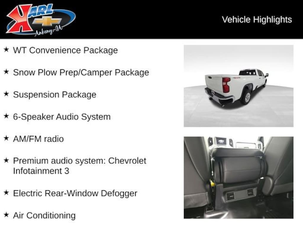 Factory MSRP: $56,760 $3,687 off MSRP! 10-Speed Automatic, 4WD, Jet Black Vinyl, 220 Amp Alternator, 6-Speaker Audio System, Air Conditioning, AM/FM radio, Brake assist, Compass, Deep-Tinted Glass, Dual front side impact airbags, Durabed Pickup Bed, Electric Rear-Window Defogger, Electronic Cruise Control w/Set & Resume Speed, Electronic Stability Control, EZ Lift Power Lock & Release Tailgate, Front 40/20/40 Split-Bench Seats w/Lockable Storage, Front anti-roll bar, Front reading lights, HD Rear Vision Camera, Heated Vertical Trailering Mirrors, LED Smoked Amber Roof Marker Lamps, Locking Tailgate, Manual Tailgate Function w/No EZ Lift, OnStar Services Capable, Outside temperature display, Overhead console, Premium audio system: Chevrolet Infotainment 3, Rear 60/40 Folding Bench Seat (Folds Up), Snow Plow Prep/Camper Package, Speed control, Split folding rear seat, Suspension Package, Wheels: 17 Silver Painted Steel, Wi-Fi Hotspot Capable, Wireless Phone Projection, WT Convenience Package.