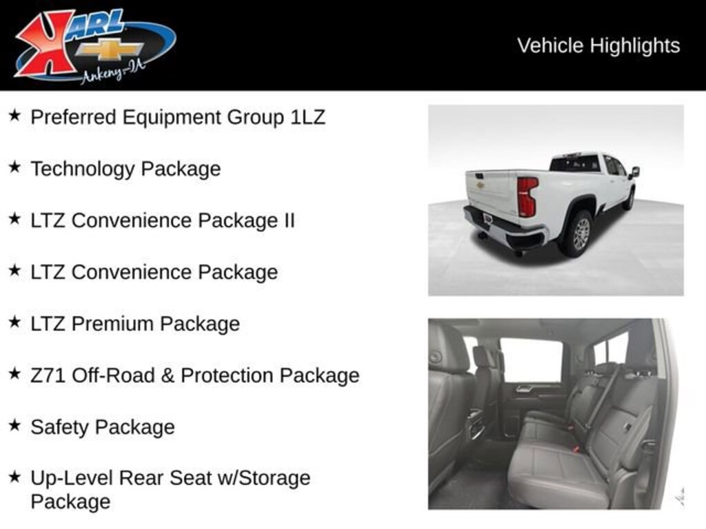 Factory MSRP: $81,959 $2,000 off MSRP! 10-Speed Automatic, 4WD, Jet Blk Perforated Lth-Ap Leather, 10-Way Power Driver Seat Adjuster w/Lumbar, 10-Way Power Passenger Seat Adjuster w/Lumbar, 120-Volt Bed Mounted Power Outlet, 120-Volt Interior Power Outlet, 15 Diagonal Multicolor Head-Up Display, 170 Amp Alternator, 1st & 2nd Row All-Weather Floor Liners (LPO) (AAK), 2 Charge/Data USB Ports Inside Center Console, 220 Amp Alternator, 3 Years SiriusXM, 6-Speaker Audio System, Adaptive Cruise Control, Apple CarPlay/Android Auto, Auto-dimming door mirrors, Auto-Dimming Inside Rear-View Mirror, Bed View Camera w/2 Trailer Camera Provisions, Black Chevytec Spray-On Bedliner, Bluetooth® For Phone, BOSE Premium 7-Speaker Sound System, Bumpers: chrome, Chevrolet Connected Access Capable, Chrome Door Handles, Chrome Mirror Caps, Color-Keyed Carpeting Floor Covering, Compass, Deep-Tinted Glass, Electric Rear-Window Defogger, Electronic Cruise Control w/Set & Resume Speed, EZ Lift Power Lock & Release Tailgate, Floor-Mounted Center Console, Front Bucket Seats, Front LED Fog Lamps, Front Rain-Sensing Wipers, Front Rubberized Vinyl Floor Mats, Gooseneck/5th Wheel Prep Package, HD Rear Vision Camera, HD Surround Vision, Heated 2nd Row Outboard Seats, Heated door mirrors, Heated Driver & Front Outboard Passenger Seating, Heated Steering Wheel, Hill Descent Control, Hitch Guidance w/Hitch View, In-Vehicle Trailering App System, Keyless Open & Start, LED Cargo Area Lighting, LED Smoked Amber Roof Marker Lamps, LTZ Convenience Package, LTZ Convenience Package II, LTZ Premium Package, Manual Tilt & Telescoping Steering Column, Multi-Flex Tailgate, Off-Road Suspension, OnStar Services Capable, Perf Leather-Appointed Front Outboard Seat Trim, Power Door Locks, Power Front Windows w/Driver Express Up/Down, Power Front Windows w/Passenger Express Up/Down, Power passenger seat, Power Rear Windows w/Express Down, Power Sliding Rear Window w/Defogger, Preferred Equipment Group 1LZ, Premium audio system: Chevrolet Infotainment 3 Premium, Push Button Start, Radio: Chevrolet Infotainment 3 Premium System, Rear Camera Mirror, Rear Cross Traffic Alert, Rear Rubberized Vinyl Floor Mats, Rear Wheelhouse Liners, Remote Vehicle Starter System, Safety Alert Seat, Safety Package, SiriusXM w/360L Trial Subscription, Snow Plow Prep/Camper Package, Split folding rear seat, Standard Tailgate, Steering Wheel Audio Controls, Suspension Package, Technology Package, Trailer Camera Provisions, Trailer Side Blind Zone Alert, Ultrasonic Front & Rear Park Assist, Unauthorized Entry Theft-Deterrent System, Universal Home Remote, Up-Level Rear Seat w/Storage Package, Ventilated Driver & Front Passenger Seats, Wheels: 18 Machined Alum w/Silver Painted Accents, Wi-Fi Hotspot Capable, Wireless Charging, Wireless Phone Projection, Wrapped Steering Wheel, Z71 Off-Road & Protection Package, Z71 Off-Road Package.