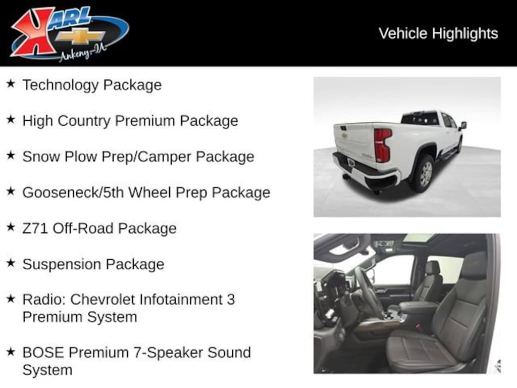 Factory MSRP: $89,099 $6,085 off MSRP! 10-Speed Automatic, 4WD, Jet Blk Perforated Lth Leather, 120-Volt Interior Power Outlet, 15 Diagonal Multicolor Head-Up Display, 220 Amp Alternator, 3 Years SiriusXM, 6 Rectangular Chromed Tubular Assist Steps, 720 Cold-Cranking Amps Heavy-Duty Battery, Air Conditioning, AM/FM radio: SiriusXM with 360L, BOSE Premium 7-Speaker Sound System, Brake assist, Bumpers: body-color, Chevrolet Connected Access Capable, Color-Keyed Carpeting Floor Covering, Deep-Tinted Glass, Driver Memory, Dual front side impact airbags, Durabed Pickup Bed, Electric Rear-Window Defogger, Electronic Stability Control, Emergency communication system: OnStar, Floor-Mounted Center Console, Front Center Armrest, Front dual zone A/C, Front fog lights, Front Rain-Sensing Wipers, Front wheel independent suspension, Garage door transmitter, Genuine wood door panel insert, Gooseneck/5th Wheel Prep Package, Heated door mirrors, Heated Steering Wheel, High Country Premium Package, Hill Descent Control, LED Cargo Area Lighting, Memory seat, Multi-Flex Tailgate, Off-Road Suspension, Perforated Leather Seat Trim, Power Door Locks, Power Sunroof, Power windows, Radio: Chevrolet Infotainment 3 Premium System, Rear Camera Mirror, Rear Wheelhouse Liners, Remote keyless entry, Snow Plow Prep/Camper Package, Speed-sensing steering, Split folding rear seat, Steering wheel mounted audio controls, Suspension Package, Technology Package, Ventilated front seats, Wheels: 20 8-Spoke Bright Finish Aluminum, Wireless Charging, Wireless Phone Projection, Wrapped Steering Wheel, Z71 Off-Road Package.
