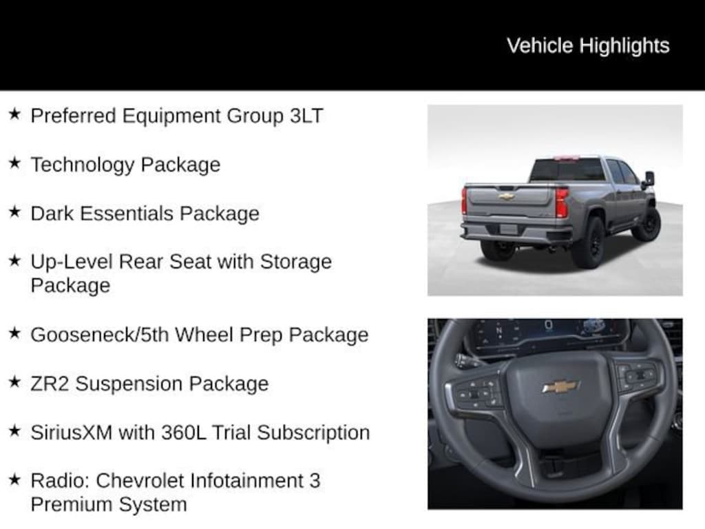- Dark Essentials Package, Gooseneck/5th Wheel Prep Package, Preferred Equipment Group 3LT, Technology Package, Up-Level Rear Seat with Storage Package, and ZR2 Suspension Package