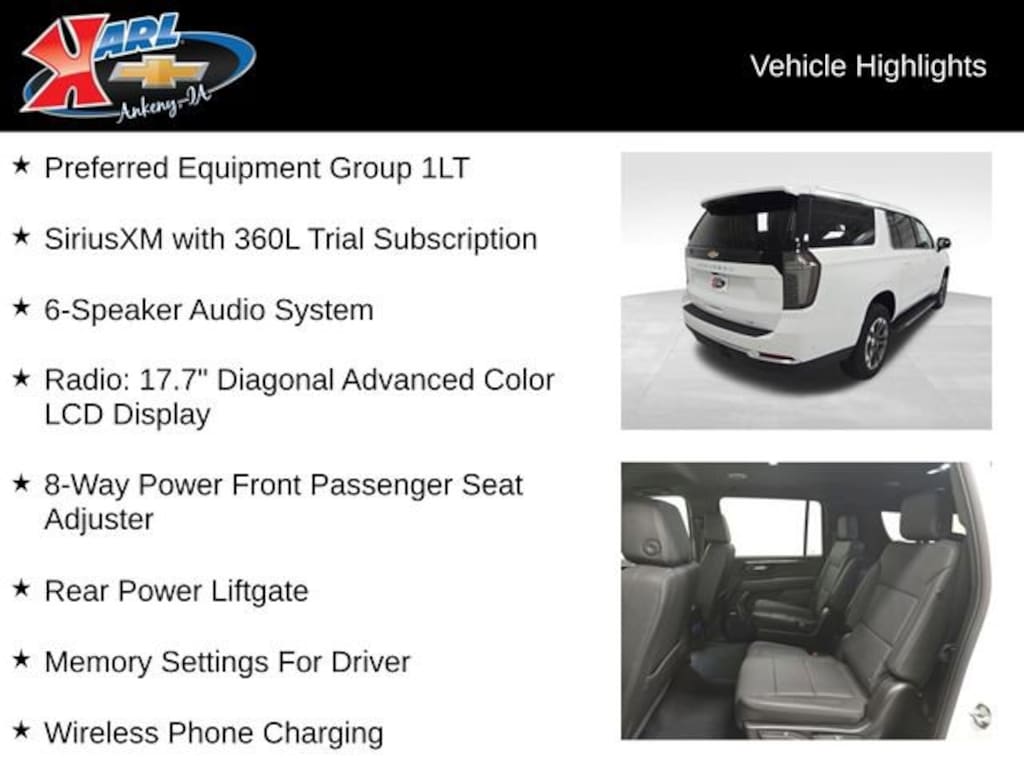 The Suburban's advanced technology features, including the 17.7 diagonal advanced color LCD display, wireless Apple CarPlay and Android Auto, and wireless phone charging, keep you connected and entertained on the go. The interior camera provides added peace of mind, while the memory settings for the driver's seat and steering wheel ensure a customized and comfortable driving experience every time.