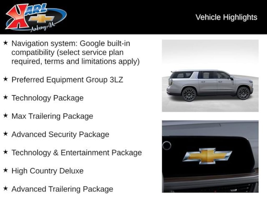 At Karl Chevrolet we want to help you find the best new or used car in Ankeny that suits your needs. When you buy a new car at Karl Chevrolet you know you're finding a vehicle you can rely on. We have a great selection of Platinum Quality Pre-Owned Vehicles. We also pride ourselves in creating a friendly atmosphere and a reliable Dealership that you can trust. Call us and our experts will be glad to help you! (515) 299-4300. *Equipment and options are generated by a 3rd party vendor, exact vehicle options may vary. Please see a salesperson for complete details and vehicle information.