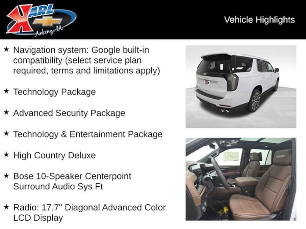 Factory MSRP: $96,374 4WD, Jet Blk/Mocha Perforated Leather, 15 Diagonal Multi-Color Head-Up Display, 1st & 2nd Row Color-Keyed Carpeted Floor Mats, 3rd Row 60/40 Power-Folding Split-Bench Seat, 3rd row seats: split-bench, 4-Way Power Front Passenger Lumbar Seat Adjuster, Advanced Security Package, Air Ride Adaptive Suspension, Apple CarPlay/Android Auto, AutoSense Hands-Free Power Liftgate, Bose 10-Speaker Centerpoint Surround Audio Sys Ft, Driver & Front Passenger Heated & Ventilated Seats, Dual-Pane Power Panoramic Sunroof, Front Bucket Seats, Front Center Armrest, Glass Breakage Sensor, Heated 2nd Row Outboard Seats, Heated Driver & Front Passenger Seats, Heated rear seats, High Country Deluxe, Navigation system: Google built-in compatibility (select service plan required, terms and limitations apply), Perforated Leather Seat Trim, Power Liftgate, Power passenger seat, Power Release 2nd Row Bucket Seats, Power-Retractable Assist Steps, Premium audio system: Chevrolet Infotainment 3 Premium, Radio: 17.7 Diagonal Advanced Color LCD Display, Rear Seat Media System, Set of 4 Wheel Locks (LPO), Split folding rear seat, Technology & Entertainment Package, Technology Package, Theft-Deterrent Alarm System, Vehicle Inclination Sensor, Vehicle Interior Movement Sensor, Ventilated front seats, Wheels: 22 x 9 Bright Machined Aluminum.