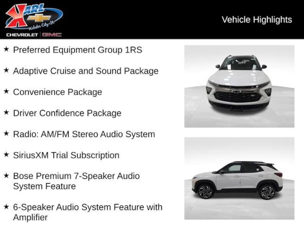 At Karl Chevrolet/GMC we want to help you find the best new or used car in Webster City that suits your needs. When you buy a new car at Karl Chevrolet/GMC you know you're finding a vehicle you can rely on. We have a great selection of CarBravo Quality Pre-Owned Vehicles. We also pride ourselves in creating a friendly atmosphere and a reliable Dealership that you can trust. Call us and our experts will be glad to help you! (515) 209-7117. *Equipment and options are generated by a 3rd party vendor, exact vehicle options may vary. Please see a salesperson for complete details and vehicle information. Price includes: $1000 - GM Financial Standalone Special APR & Down Payment Assistance Program: $1000 discount and 14.90% APR for 36 months. $34.62 per $1000 financed. Available to well qualified buyers who finance through GM Financial. XGU. Exp. 04/30/2026