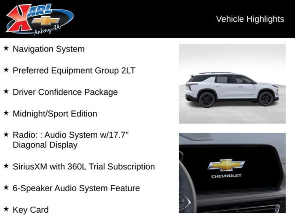 At Karl Chevrolet, we are dedicated to helping you find the perfect vehicle that meets your needs and exceeds your expectations. This 2026 Chevrolet Traverse LT In-Transit is a testament to our commitment to quality and customer satisfaction. We invite you to experience the exceptional features and capabilities of this remarkable SUV. Contact us today at (515) 299-4300 to schedule a test drive and let our experts guide you through the process of making this Traverse your own.