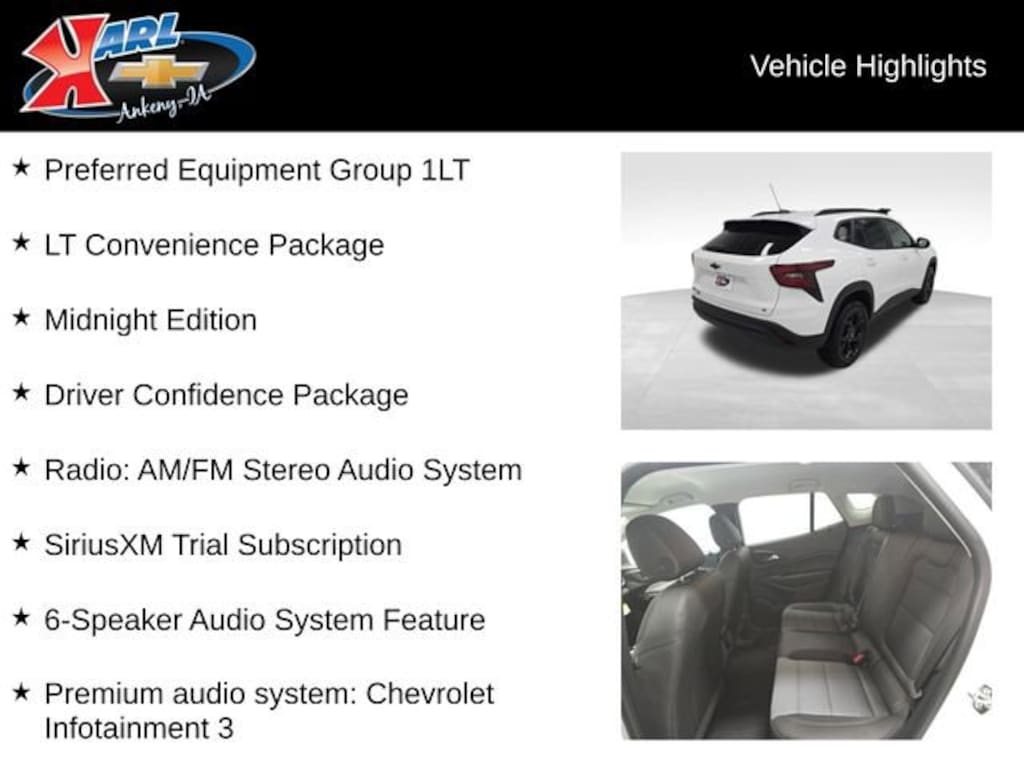 Factory MSRP: $27,379 $1,666 off MSRP! 28/32 City/Highway MPG 2-Way Adjustable Front Head Restraints, 4-Way Manual Front Passenger Seat Adjuster, 6-Speaker Audio System Feature, 6-Way Manual Driver Seat Adjuster, Adaptive Cruise Control, Cloth/Evotex Seat Trim, Driver Confidence Package, Front Bucket Seats, Front Center Armrest, Front Doors Keyless Open, Heated Driver and Front Passenger Seats, Heated Power-Adjustable Outside Mirrors, Heated Steering Wheel, High Gloss Black Mirror Caps, Lane Change Alert with Side Blind Zone Alert, LT Convenience Package, Midnight Edition, Preferred Equipment Group 1LT, Premium audio system: Chevrolet Infotainment 3, Radio: AM/FM Stereo Audio System, Rear Cross Traffic Alert, Rear Park Assist, SiriusXM Trial Subscription, Split folding rear seat, Wheels: : 17 High Gloss Black Alloy, Wireless Apple CarPlay/Wireless Android Auto, Wrapped Steering Wheel.