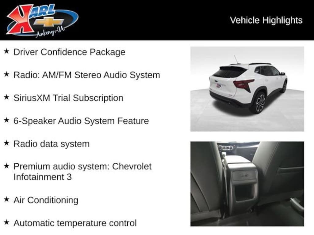 Factory MSRP: $27,789 $1,613 off MSRP! 28/32 City/Highway MPG 2-Way Adjustable Front Head Restraints, 2-Way Power Driver Lumbar Seat Adjuster, 6-Speaker Audio System Feature, 8-Way Power Driver Seat Adjuster, Adaptive Cruise Control, Air Conditioning, Automatic temperature control, Brake assist, Driver Confidence Package, Driver door bin, Driver vanity mirror, Dual front impact airbags, Electronic Stability Control, Evotex Seat Trim, Exterior Parking Camera Rear, Front Center Armrest, Front reading lights, Heated door mirrors, Heated front seats, Heated steering wheel, Low tire pressure warning, Occupant sensing airbag, Power door mirrors, Power steering, Premium audio system: Chevrolet Infotainment 3, Radio data system, Radio: AM/FM Stereo Audio System, Rear Cross Traffic Alert, Rear Park Assist, Rear window wiper, Remote keyless entry, SiriusXM Trial Subscription, Sport steering wheel, Steering wheel mounted audio controls, Tachometer, Wheels: 19 Black-Painted Machined Aluminum, Wireless Apple CarPlay/Wireless Android Auto.