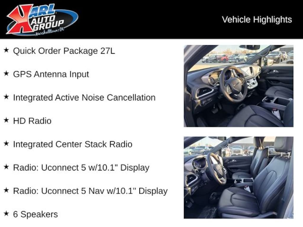 When you buy a new car at Karl or Marshalltown you know you're finding a vehicle you can rely on. We have a great selection of new vehicles for you to test drive around Newton and Des Moines, IA. We also pride ourselves in creating a friendly atmosphere and reliable new car dealership that you can trust. Call us with any questions about our 2026 Chrysler Pacifica and our experts will be glad to help you! (641) 752-7101. *Equipment and options are generated by a 3rd party vendor, exact vehicle options may vary. Please see a salesperson for complete details and vehicle information. Price includes: $2250 - 2026 National Retail Bonus Cash . Exp. 01/05/2026 $500 - 2026 National Regional Retail Bonus Cash. Exp. 01/05/2026 $750 - 2026 National Bonus Cash . Exp. 01/05/2026