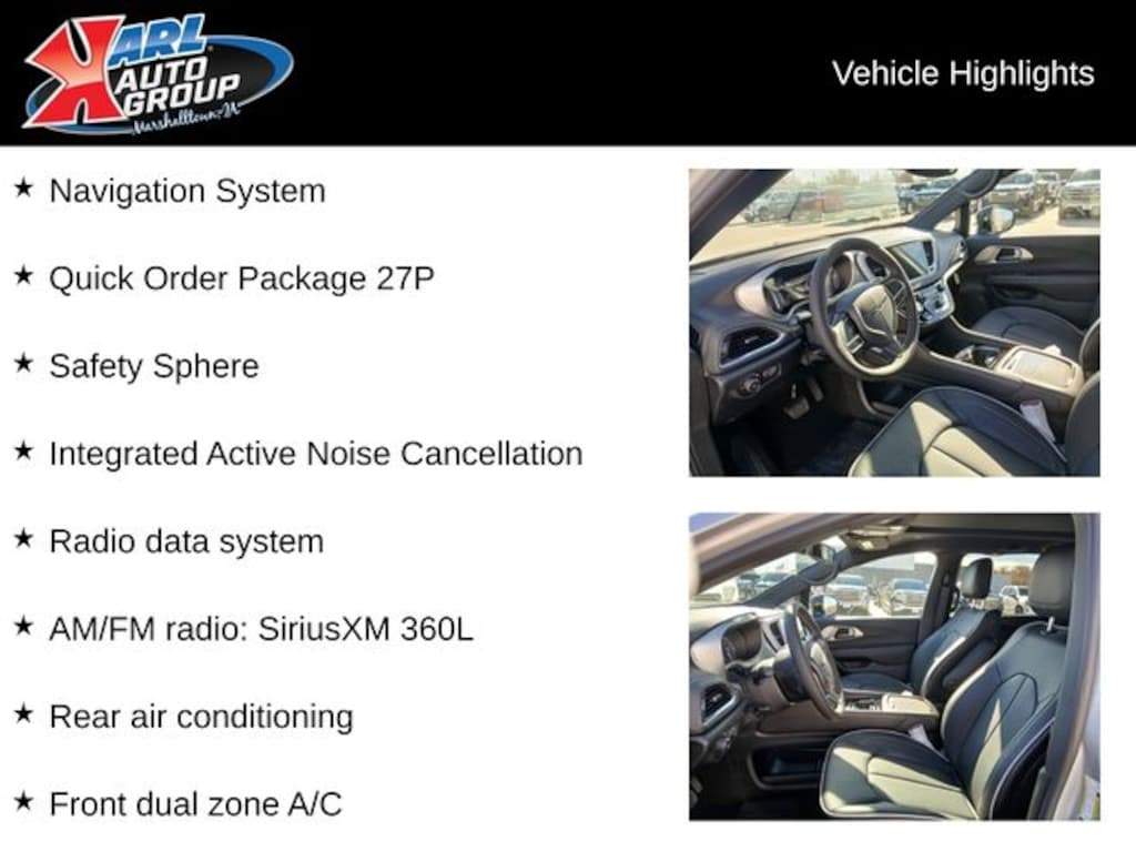 When you buy a new car at Karl or Marshalltown you know you're finding a vehicle you can rely on. We have a great selection of new vehicles for you to test drive around Newton and Des Moines, IA. We also pride ourselves in creating a friendly atmosphere and reliable new car dealership that you can trust. Call us with any questions about our 2026 Chrysler Pacifica and our experts will be glad to help you! (641) 752-7101. *Equipment and options are generated by a 3rd party vendor, exact vehicle options may vary. Please see a salesperson for complete details and vehicle information. Price includes: $2250 - 2026 National Retail Bonus Cash . Exp. 01/05/2026 $500 - 2026 National Regional Retail Bonus Cash. Exp. 01/05/2026 $750 - 2026 National Bonus Cash . Exp. 01/05/2026