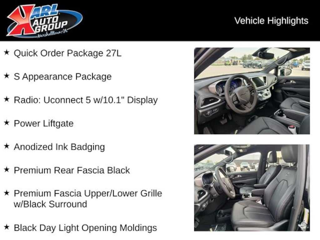 When you buy a new car at Karl or Marshalltown you know you're finding a vehicle you can rely on. We have a great selection of new vehicles for you to test drive around Newton and Des Moines, IA. We also pride ourselves in creating a friendly atmosphere and reliable new car dealership that you can trust. Call us with any questions about our 2026 Chrysler Pacifica and our experts will be glad to help you! (641) 752-7101. *Equipment and options are generated by a 3rd party vendor, exact vehicle options may vary. Please see a salesperson for complete details and vehicle information. Price includes: $2250 - 2026 National Retail Bonus Cash . Exp. 12/01/2025 $500 - 2026 National Regional Retail Bonus Cash. Exp. 12/01/2025 $750 - 2026 National Bonus Cash . Exp. 12/01/2025