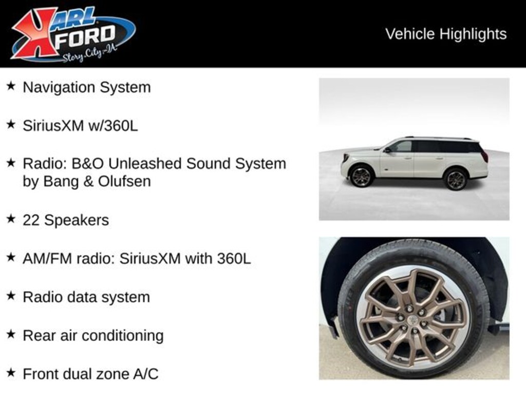 Your Dealer for Life, Karl Ford of Story City. When you buy a new car at Karl Ford of Story City you know you're finding a vehicle you can rely on. We have a great selection of new vehicles for you to test drive around Ames and Des Moines, IA. We also pride ourselves in creating a friendly atmosphere and reliable new car dealership that you can trust. Call us with any questions about our 2025 Ford Expedition Max and our experts will be glad to help you! (515) 733-4364. *Equipment and options are generated by a 3rd party vendor, exact vehicle options may vary. Please see a salesperson for complete details and vehicle information.